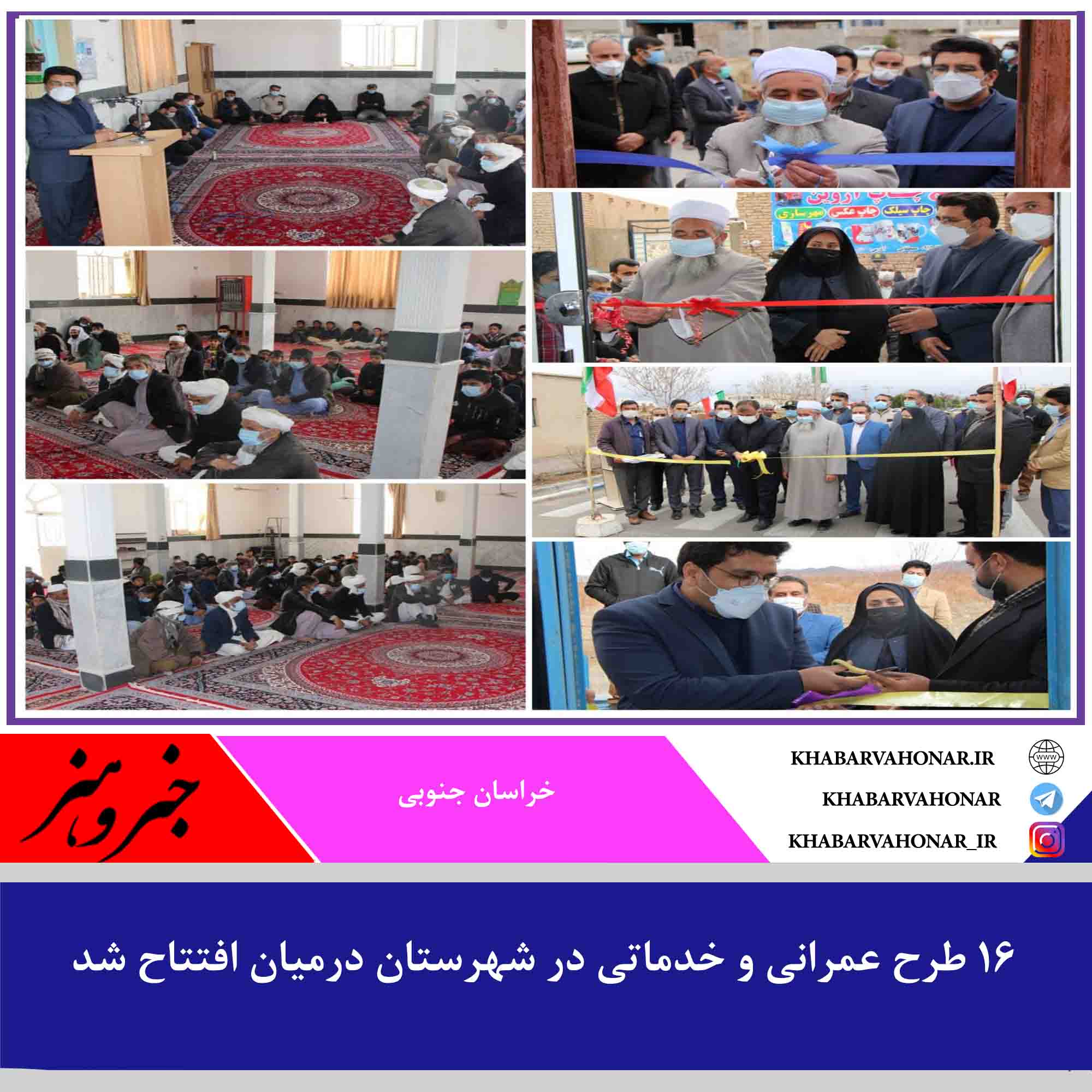 همزمان با پنجمین روز دهه فجر ۱۶ طرح عمرانی و خدماتی با اعتبار چهار میلیارد و ۳۷۵ میلیون تومان در شهرستان مرزی درمیان به بهرهبرداری رسید.