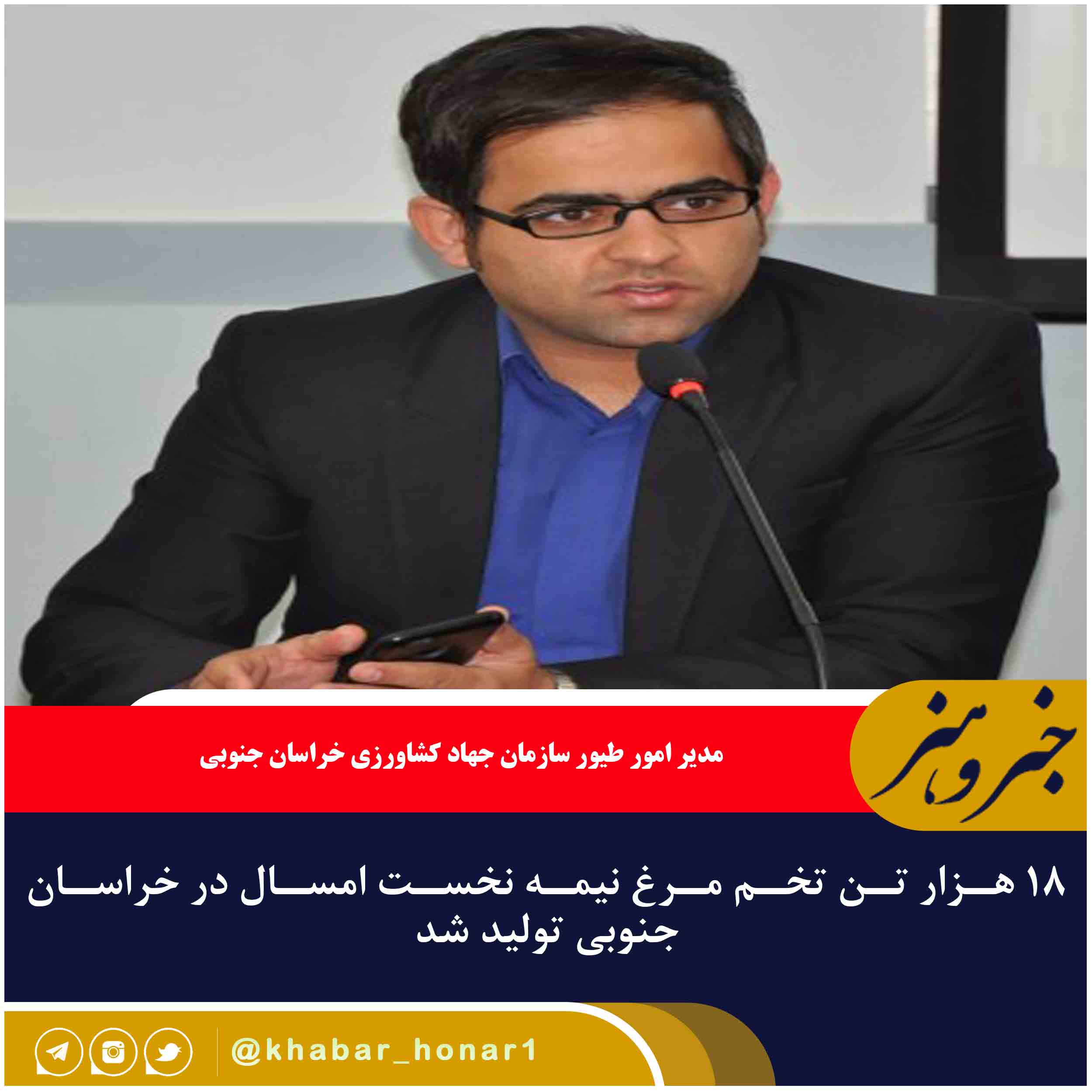 مدیر امور طیور سازمان جهاد کشاورزی خراسان جنوبی گفت: نیمه نخست امسال ۱۸ هزار تن تخم مرغ در این استان تولید شد و ۷۰ درصد تخم مرغ تولیدی به سایر استانها و کشورهای هدف صادر میشود.