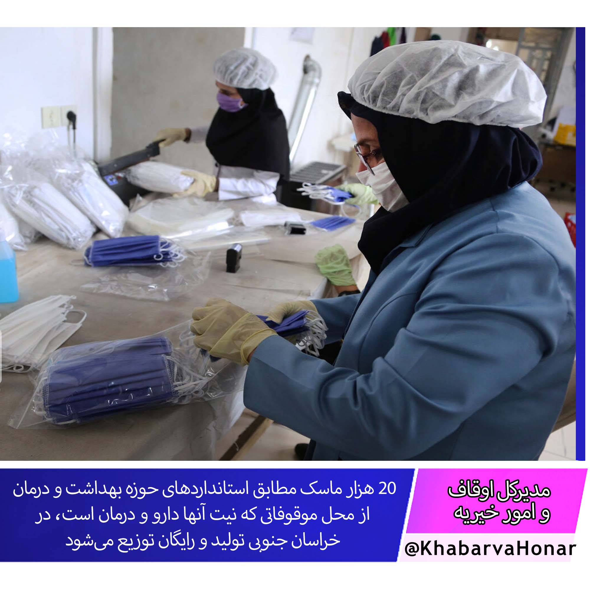 مدیرکل اوقاف و امور خیریه خراسان جنوبی گفت: ۲۰ هزار ماسک مطابق استانداردهای حوزه بهداشت و درمان از محل موقوفاتی که نیت آنها دارو و درمان است، در خراسان جنوبی تولید و رایگان توزیع میشود.