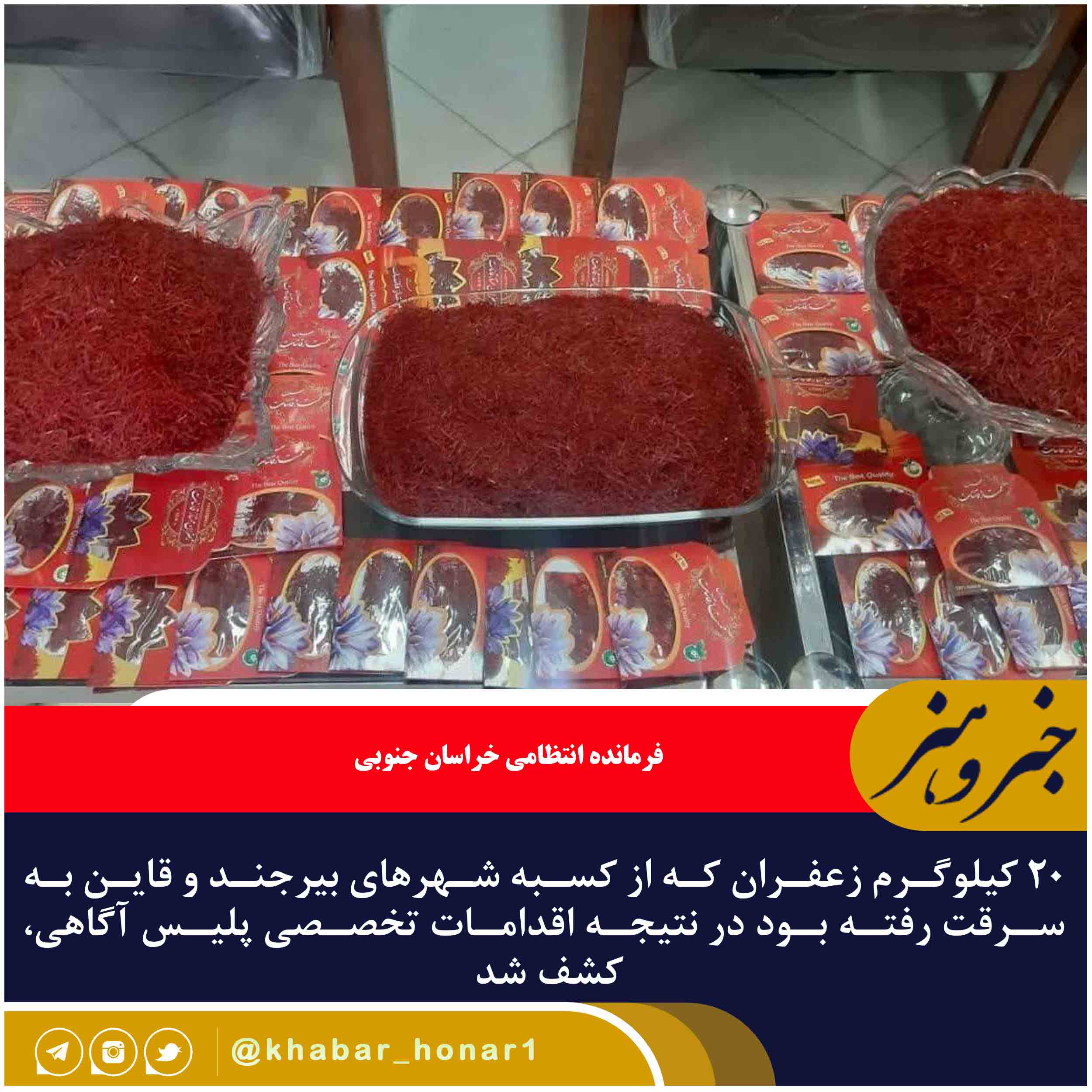 فرمانده انتظامی خراسان جنوبی گفت: ۲۰ کیلوگرم زعفران که از کسبه شهرهای بیرجند و قاین به سرقت رفته بود در نتیجه اقدامات تخصصی پلیس آگاهی، کشف شد.