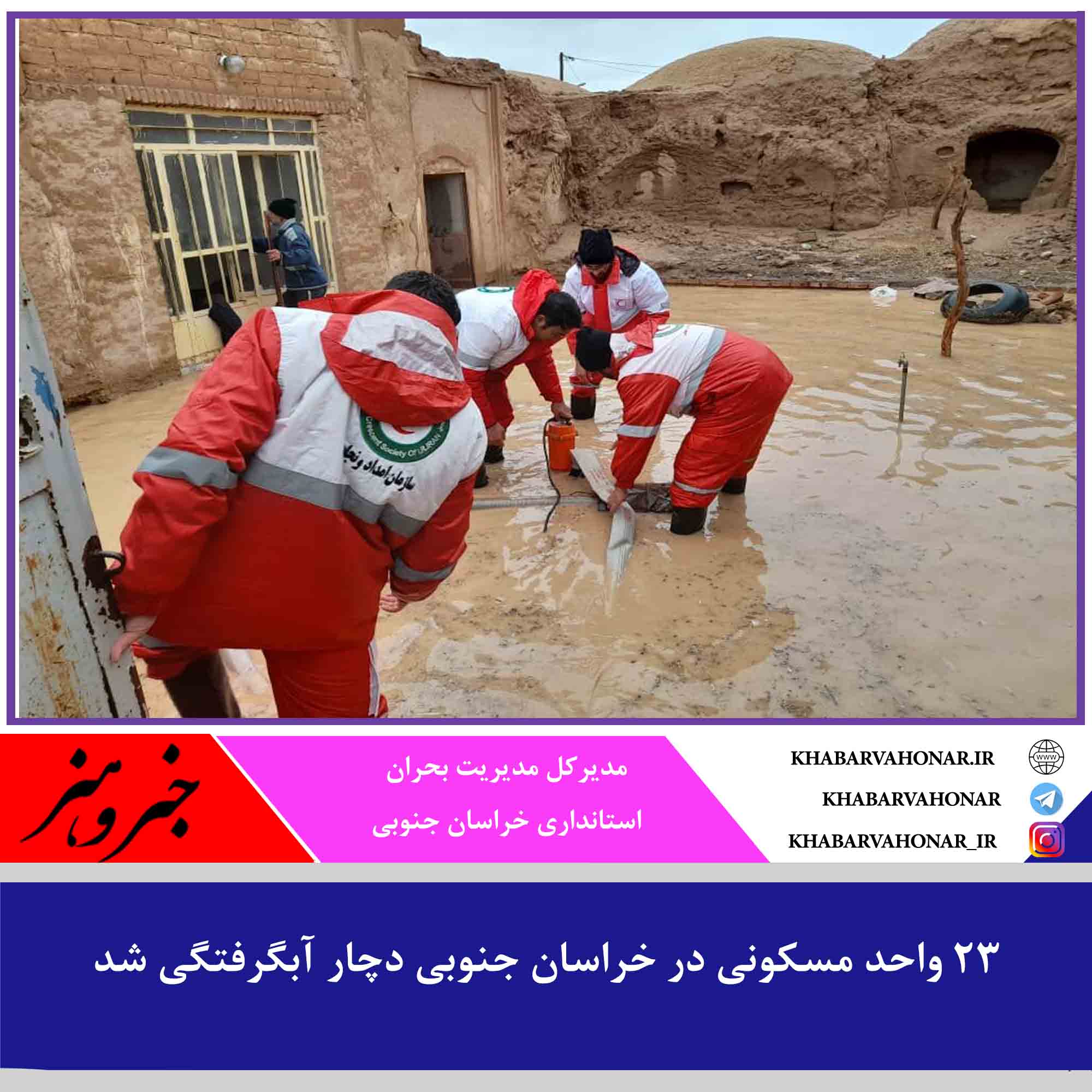 مدیرکل مدیریت بحران استانداری خراسان جنوبی گفت: ۲۳ واحد مسکونی در این استان بر اثر سیلاب دچار آبگرفتگی شد که بلافاصله نیروهای امدادی برای رفع مشکل آنها وارد عمل شدند.