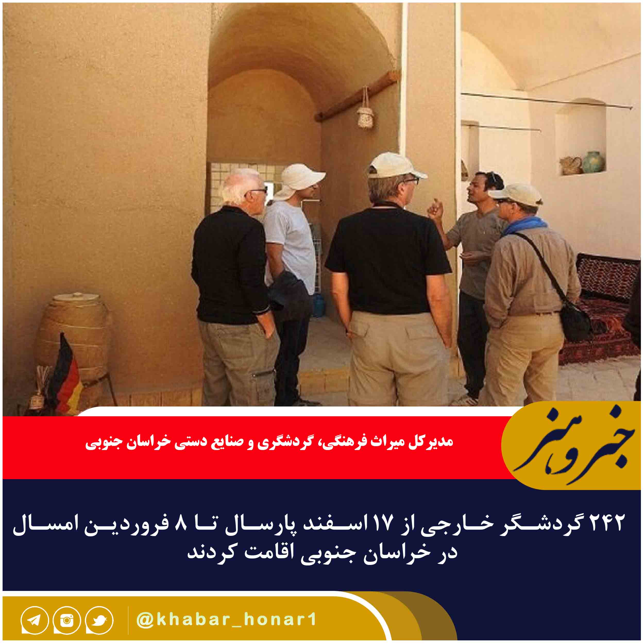 مدیرکل میراث فرهنگی، گردشگری و صنایع دستی خراسان جنوبی گفت: از ۱۷ اسفند پارسال تا ۸ فروردین امسال ۲۴۲ گردشگر خارجی در مراکز اقامتی استان اسکان داشتهاند.
