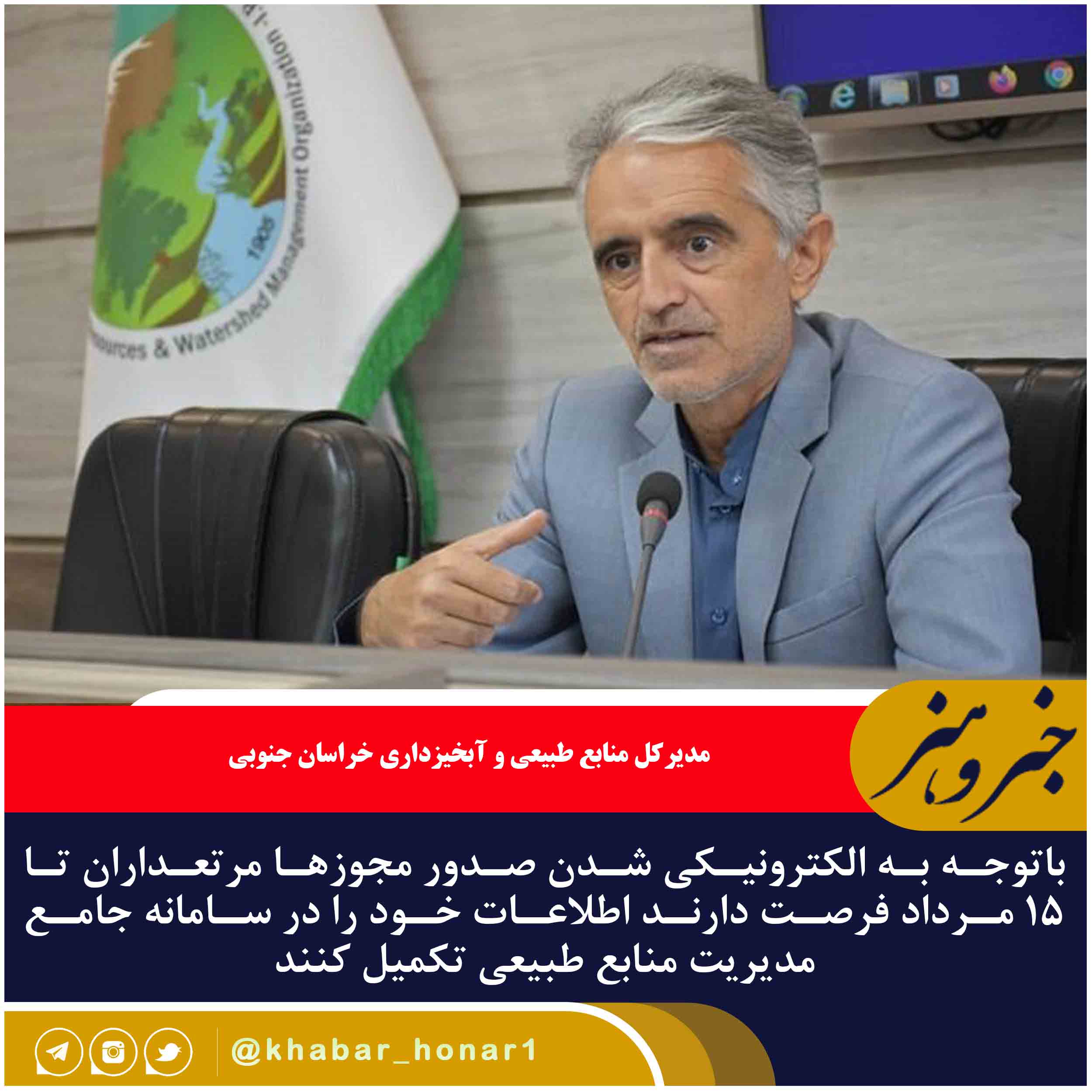 مدیرکل منابع طبیعی و آبخیزداری خراسان جنوبی گفت: باتوجه به الکترونیکی شدن صدور مجوزها مرتعداران تا ۱۵ مرداد فرصت دارند اطلاعات خود را در سامانه جامع مدیریت منابع طبیعی تکمیل کنند.