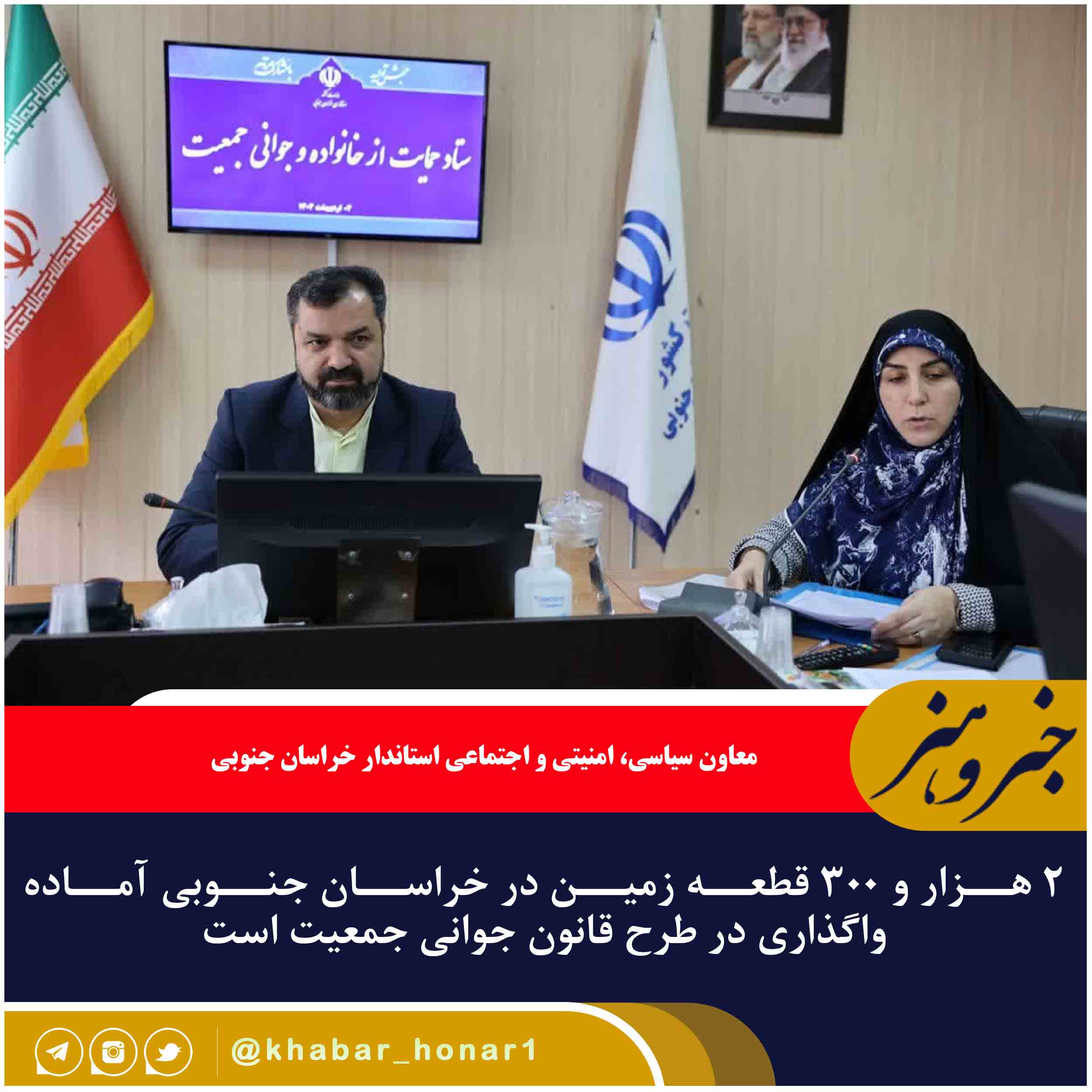 معاون سیاسی، امنیتی و اجتماعی استاندار خراسان جنوبی گفت: ۲ هزار و ۳۰۰ قطعه زمین در ۲ منطقه استان آماده قرعه کشی برای خانوادههای مشمول قانون جوانی جمعیت است و در واگذاری زمینها هیچ محدودیتی نداریم.