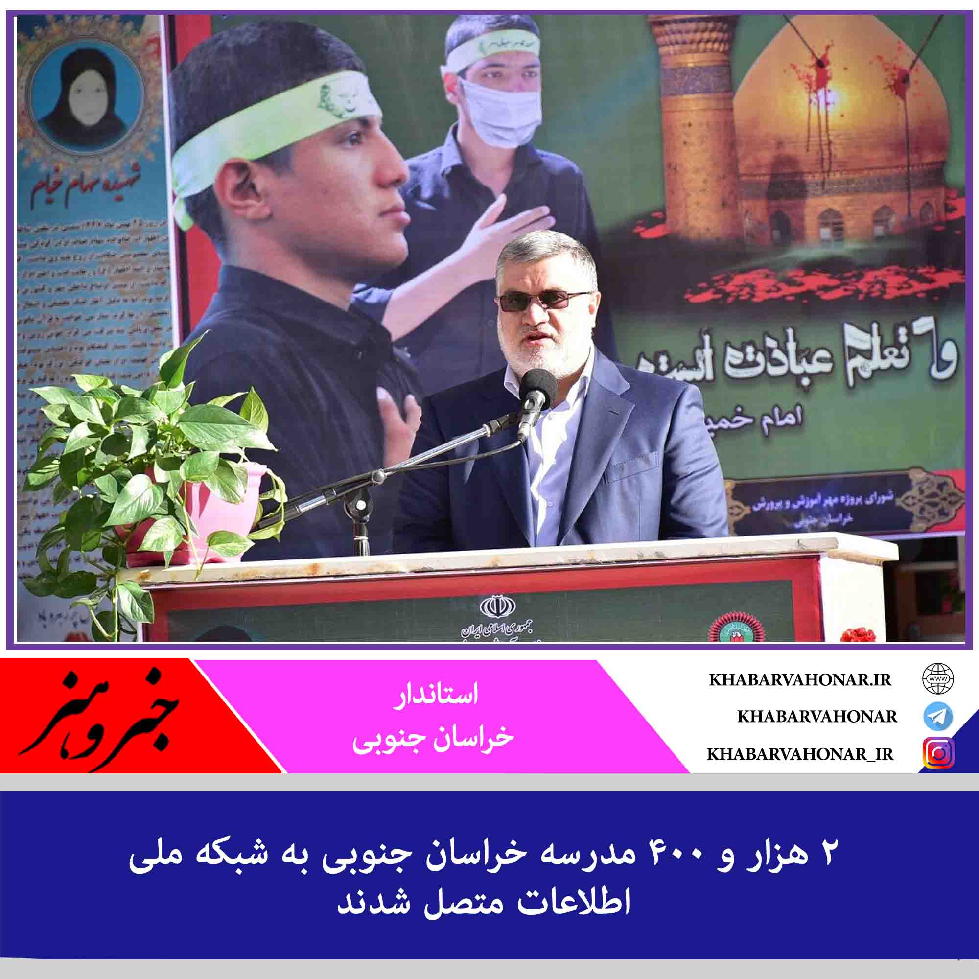 استاندار خراسان جنوبی گفت: در حال حاضر بیش از ۲ هزار و ۴۰۰ مدرسه از مجموع ۲ هزار و ۷۰۰ مدرسه استان به شبکه ملی اطلاعات متصل شدهاند و از زیرساخت اینترنت بهرهمند هستند.