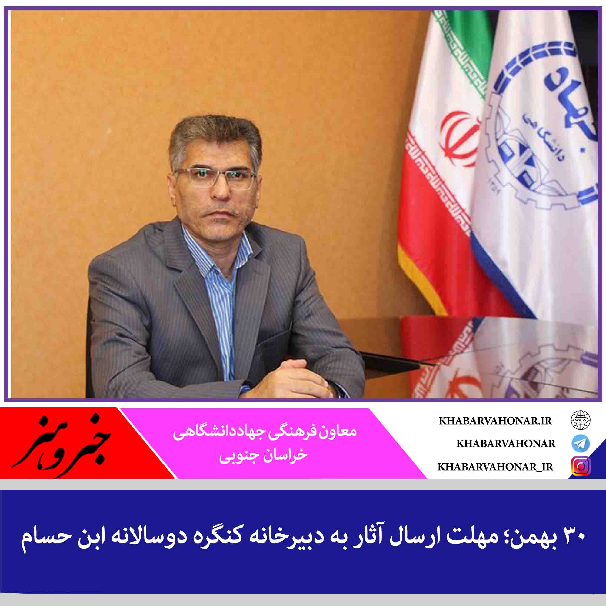 معاون فرهنگی جهاددانشگاهی خراسان جنوبی از برگزاری کنگره دوسالانه فرهنگی، هنری و ادبی ابن حسام فروردین ماه ۱۴۰۰ خبر داد و گفت: علاقمندان میتوانند جهت شرکت در این کنگره آثار خود را به آدرس www.jdkhj.ir(بخش رویدادها) ارسال کنند.