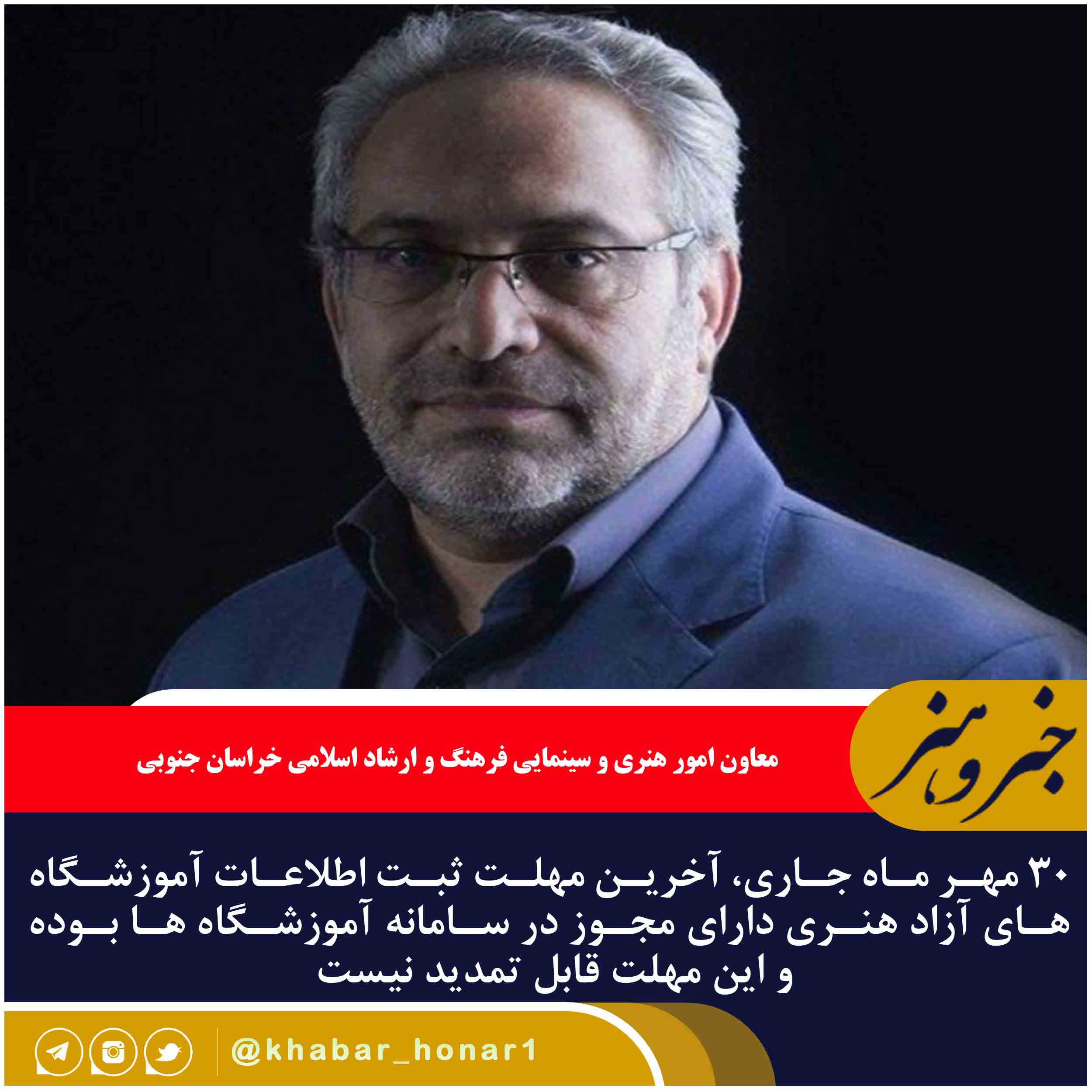 معاون امور هنری و سینمایی اداره کل فرهنگ و ارشاد اسلامی خراسان جنوبی بیان کرد: از آموزشگاه های آزاد هنری که تاکنون موفق به ثبت اطلاعات در این سامانه نشده اند، خواستاریم تا پایان مهر ماه جاری نسبت به این مهم اقدام کنند.