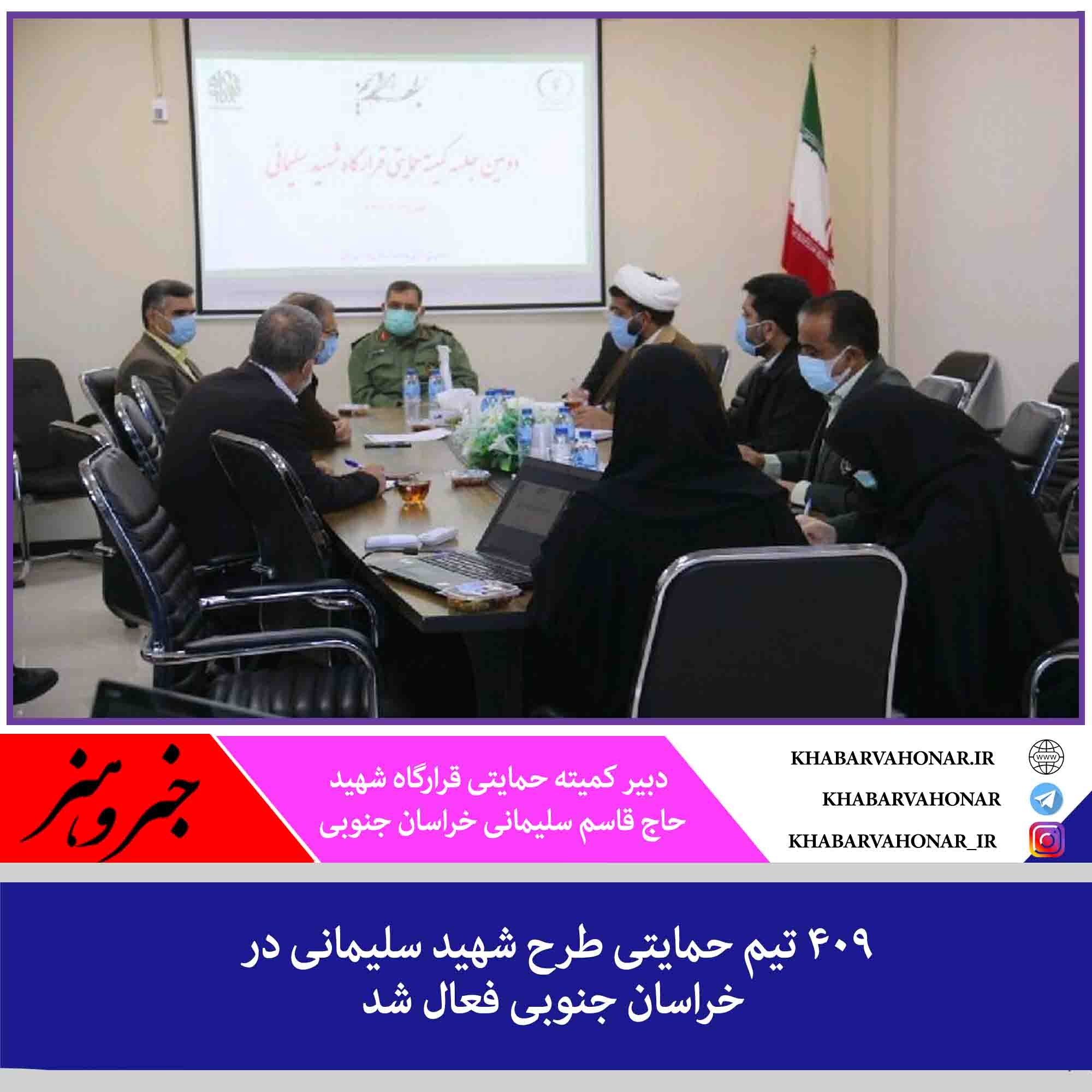 دبیر کمیته حمایتی قرارگاه شهید حاج قاسم سلیمانی خراسان جنوبی گفت: ۴۰۹ تیم حمایتی به تعداد هزار قالب هزار و ۴۰۰ نفر در قالب طرح محله محور شهید سلیمانی در محلات استان مشغول فعالیت هستند.