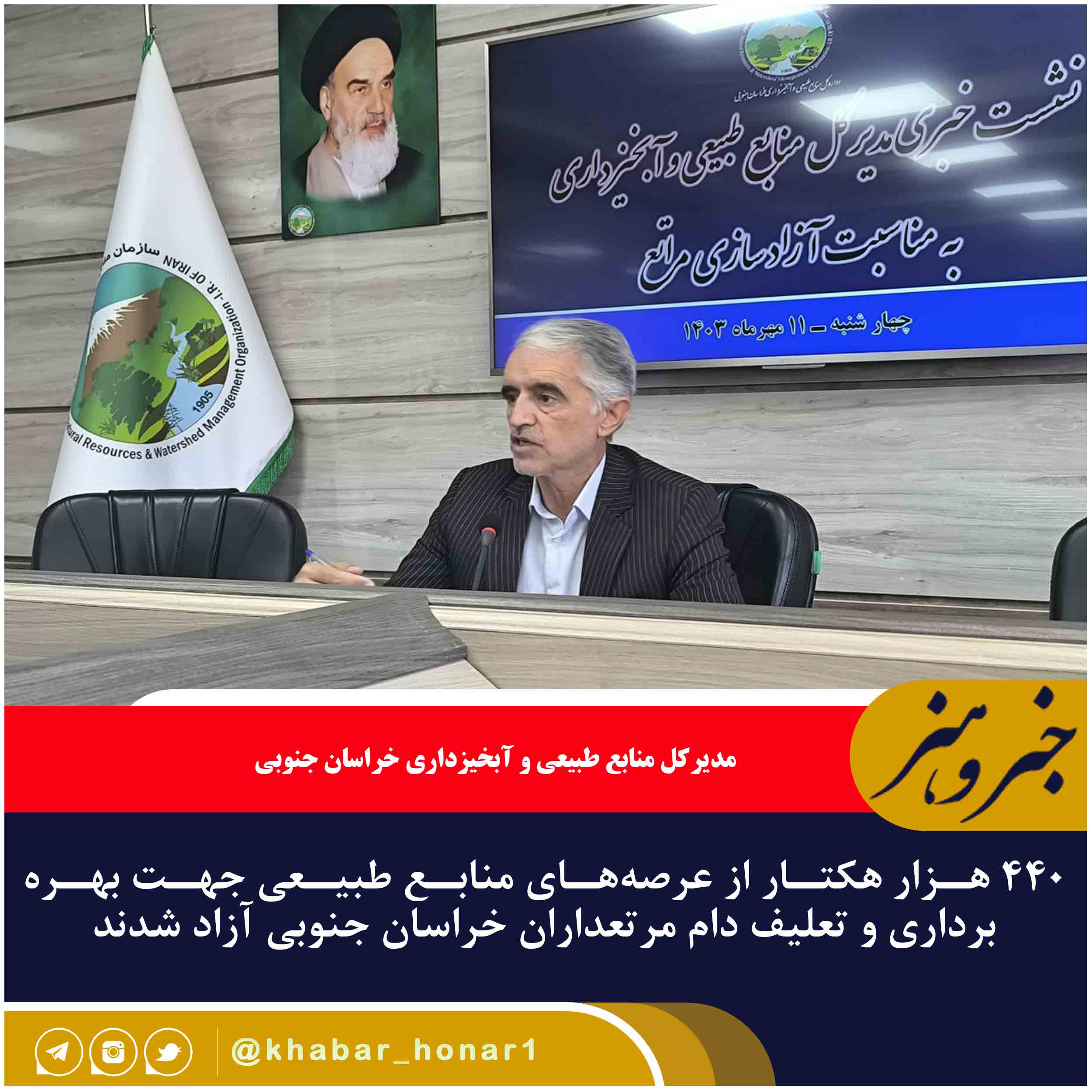مدیرکل منابع طبیعی و آبخیزداری خراسان جنوبی گفت: از اول مهر ۴۴۰ هزار هکتار از عرصههای منابع طبیعی خراسان جنوبی آزاد شدند.