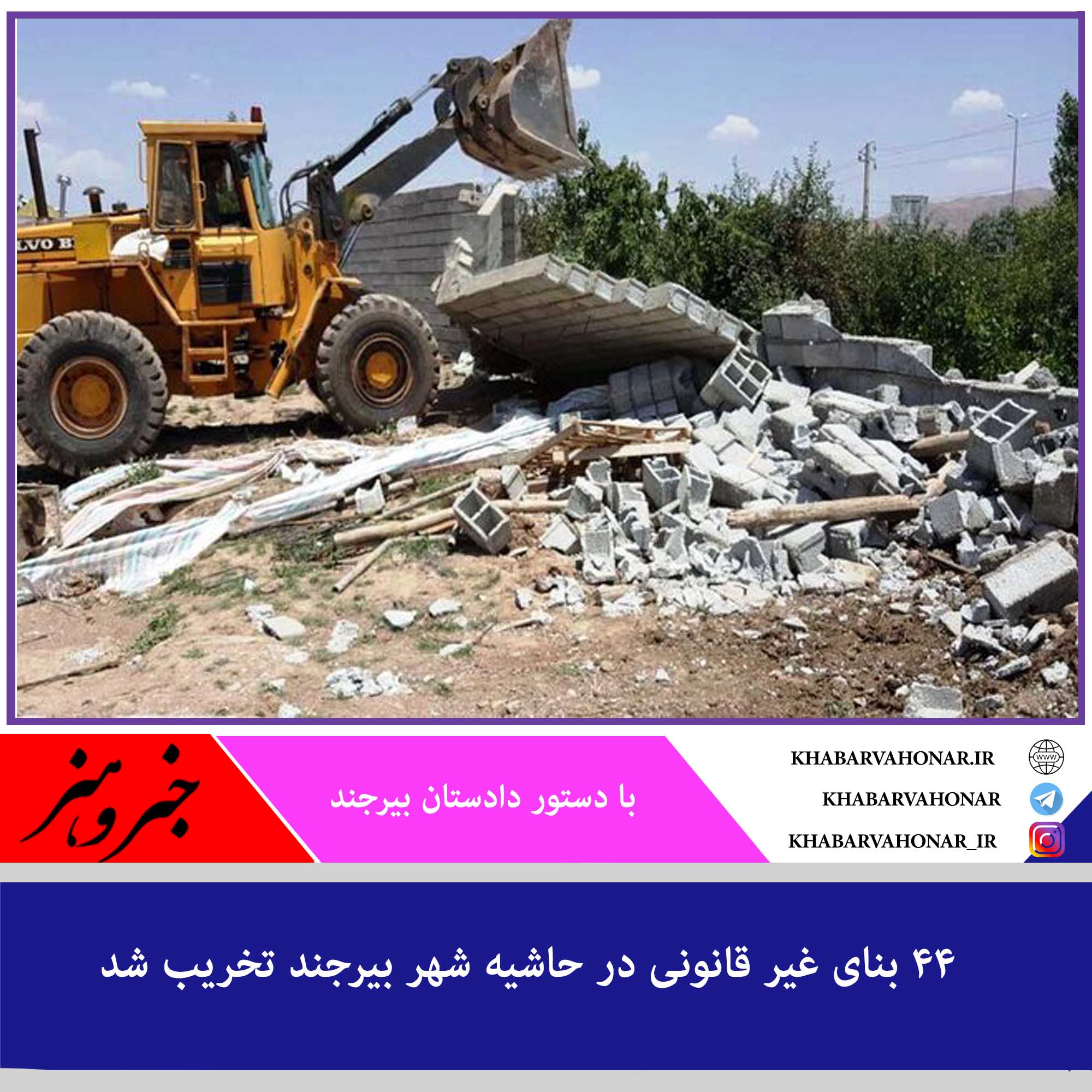 با دستور دادستان عمومی و انقلاب شهرستان بیرجند، ۴۴ بنای غیر قانونی و غیر مجاز ساخته شده در حاشیه شهر تخریب شد.