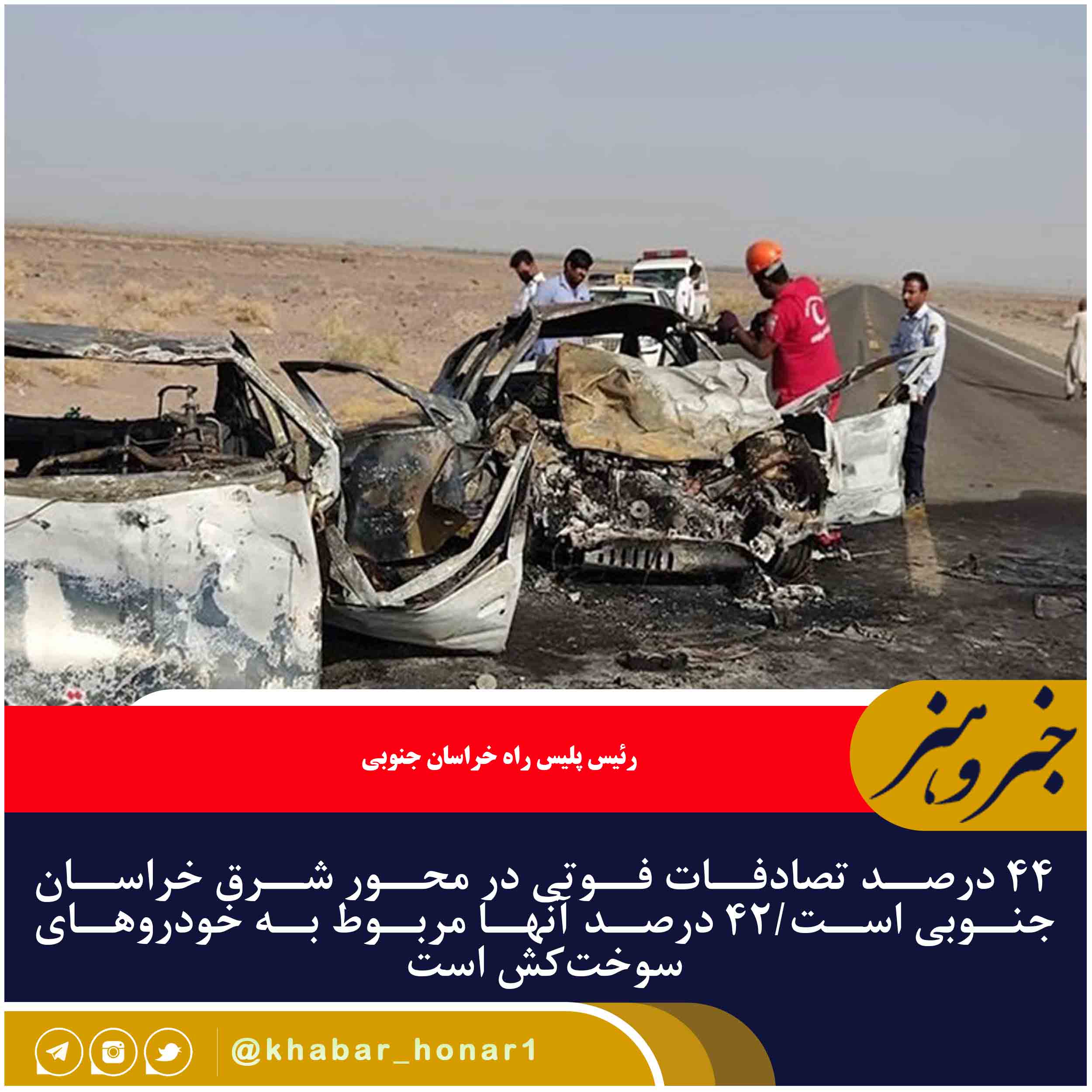 رئیس پلیس راه خراسان جنوبی گفت: محور شرق استان در مسیر مشهد – زاهدان با ۱۰۸ فوتی از ابتدای امسال تاکنون ۴۴ درصد حوادث جادهای را به خود اختصاص داده که ۴۲ درصد آنها مربوط به خودروهای سوختکش است.