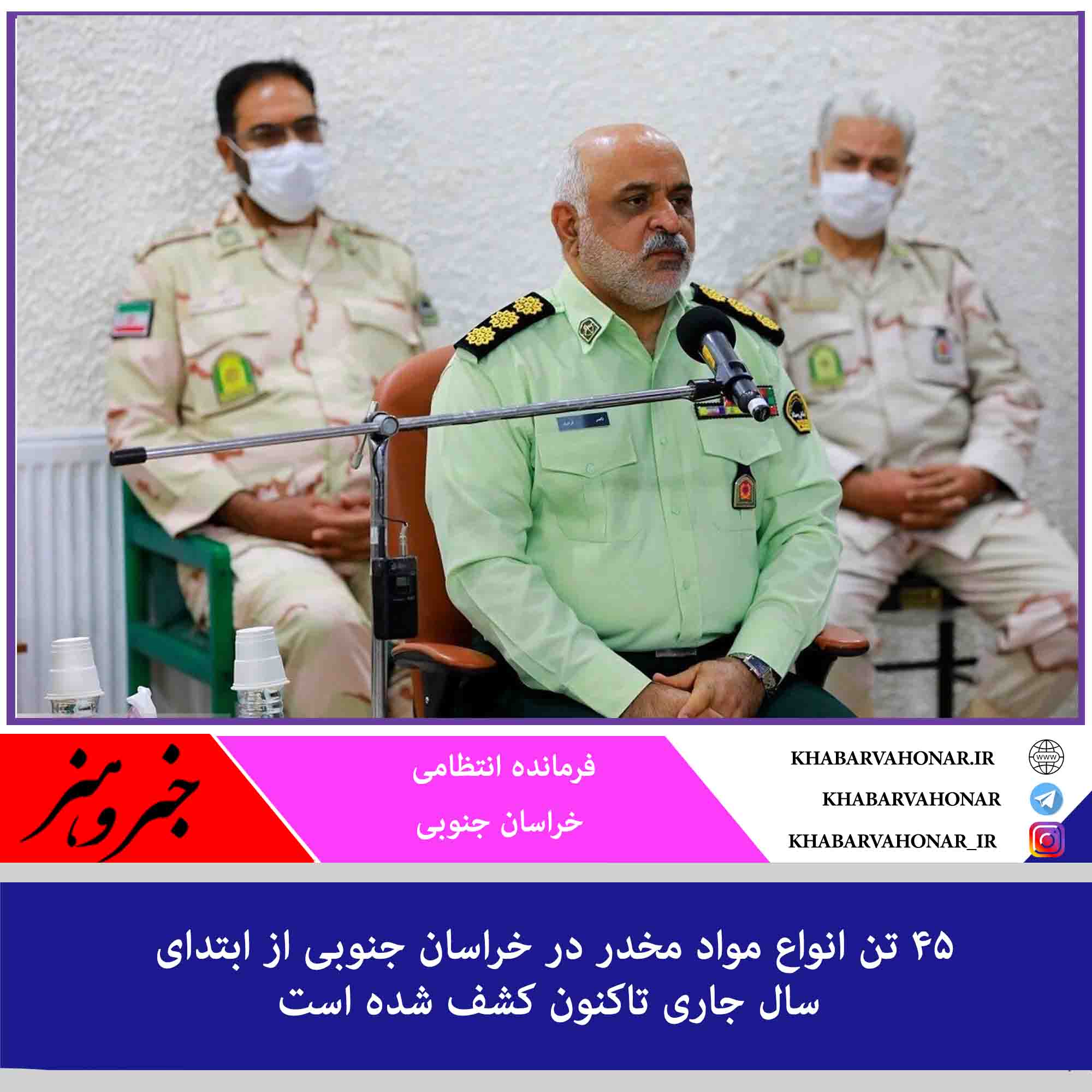فرمانده انتظامی خراسان جنوبی گفت: از ابتدای سال جاری تاکنون ۴۵ تن انواع مواد مخدر در استان توسط ماموران انتظامی کشف شده است.