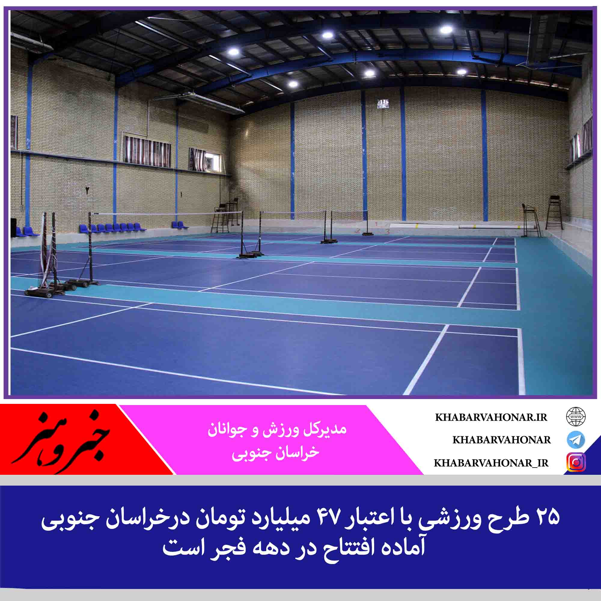 مدیرکل ورزش و جوانان خراسان جنوبی گفت: ۲۵ طرح ورزشی با اعتبار ۴۷ میلیارد تومان در استان آماده افتتاح در دهه فجر است.