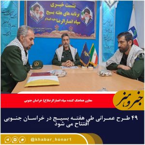 معاون هماهنگ کننده سپاه انصارالرضا(ع) خراسان جنوبی گفت: هفته بسیج سال جاری ۴۹ طرح عمرانی با اعتباری بالغ بر ۴۳۰ میلیارد ریال به بهره برداری می رسد.