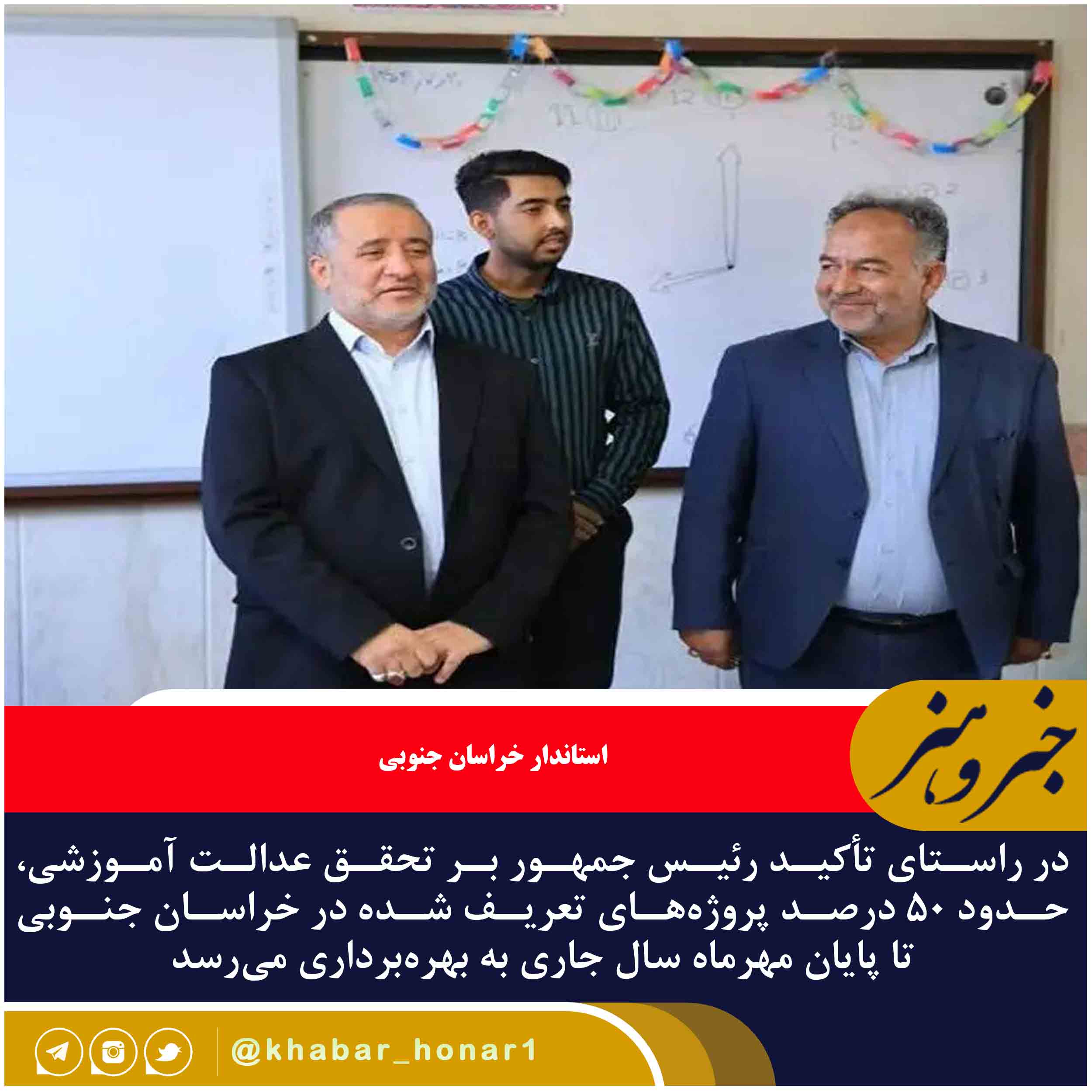 استاندار خراسان جنوبی گفت:در راستای تأکید رئیس جمهور بر تحقق عدالت آموزشی، حدود ۵۰ درصد پروژههای تعریف شده در خراسان جنوبی تا پایان مهرماه سال جاری به بهرهبرداری میرسد.