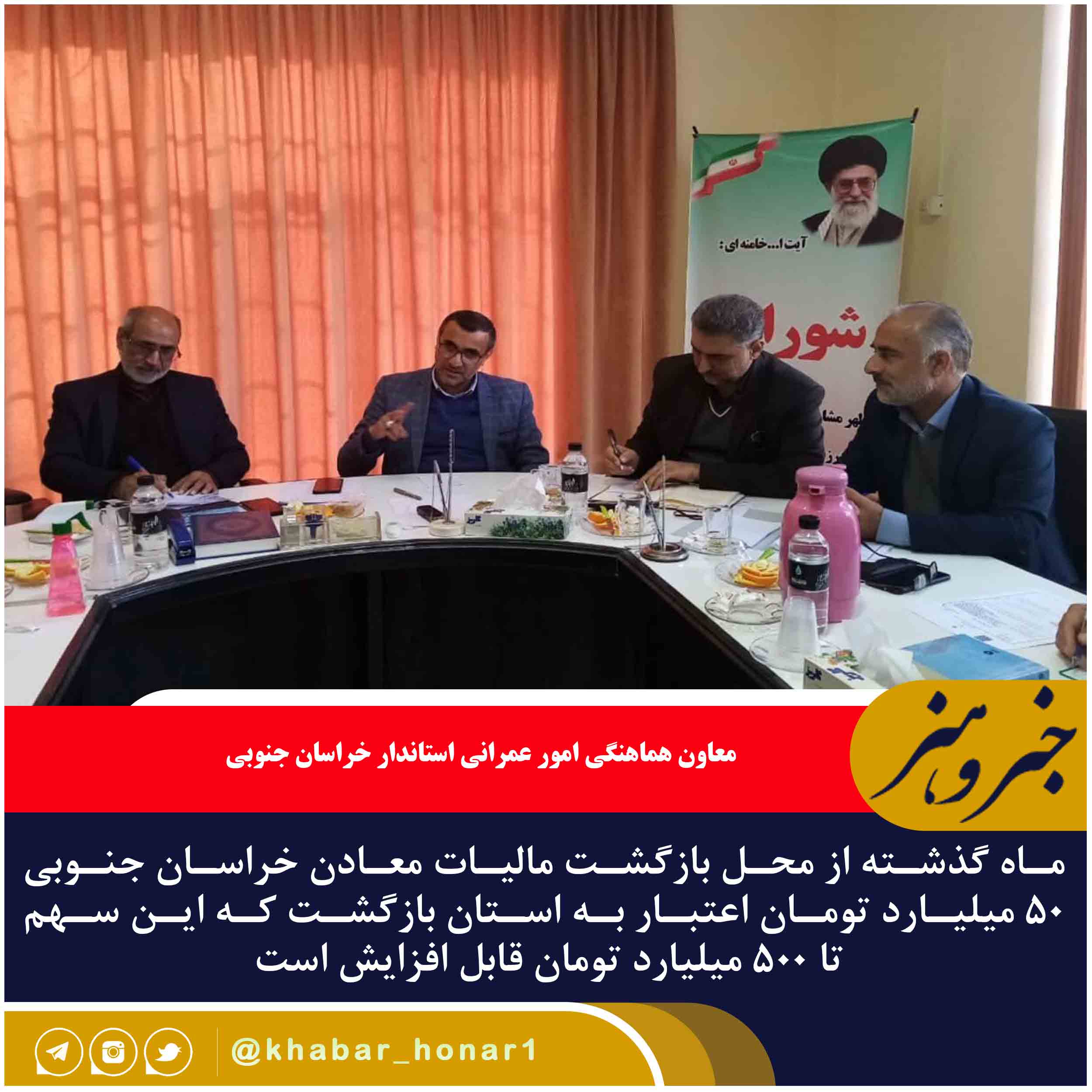معاون هماهنگی امور عمرانی استاندار خراسان جنوبی گفت: ماه گذشته از محل بازگشت مالیات معادن خراسان جنوبی ۵۰ میلیارد تومان اعتبار به استان بازگشت که این سهم تا ۵۰۰ میلیارد تومان قابل افزایش است.