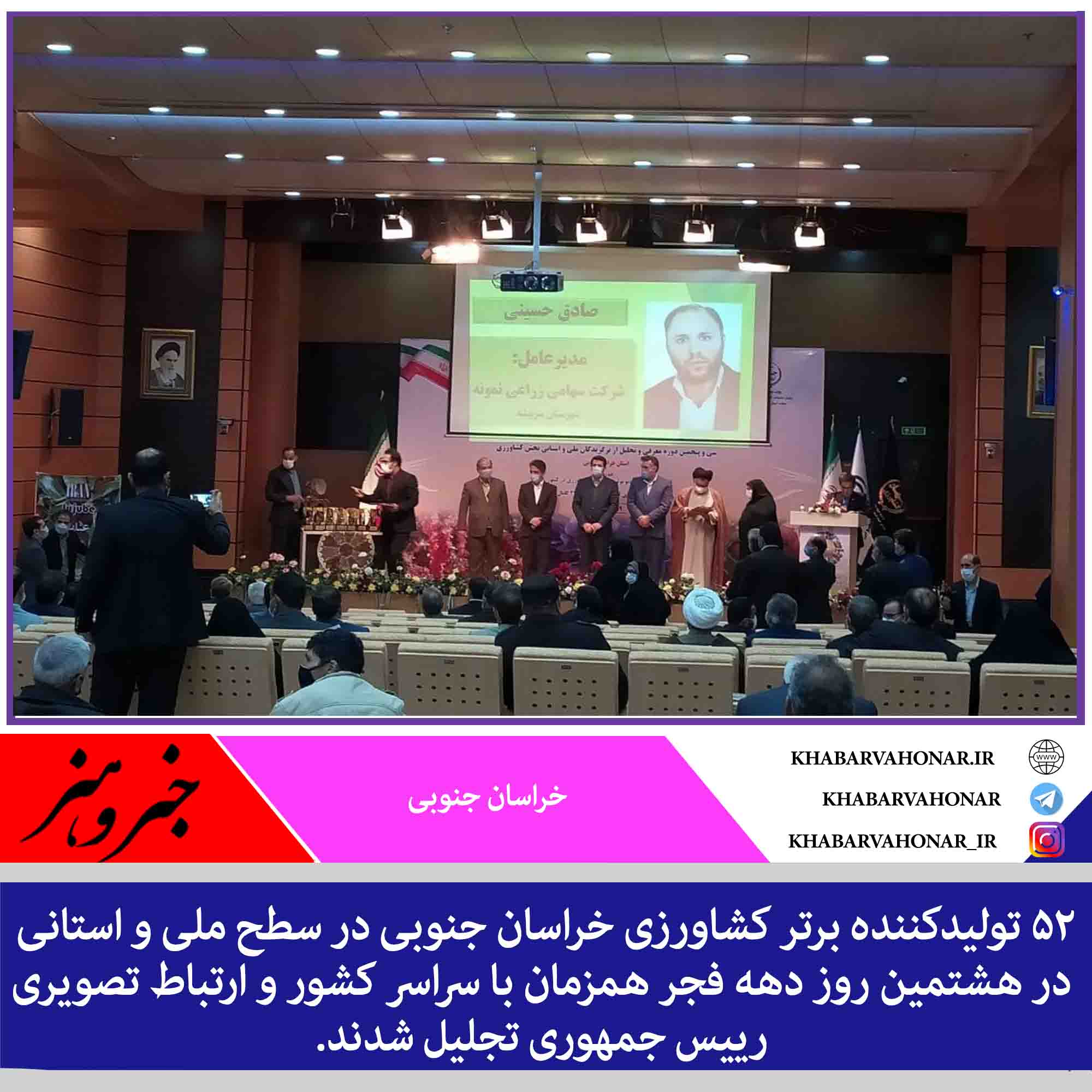 ۵۲ تولیدکننده برتر کشاورزی خراسان جنوبی در سطح ملی و استانی در هشتمین روز دهه فجر همزمان با سراسر کشور و ارتباط تصویری رییس جمهوری تجلیل شدند.
