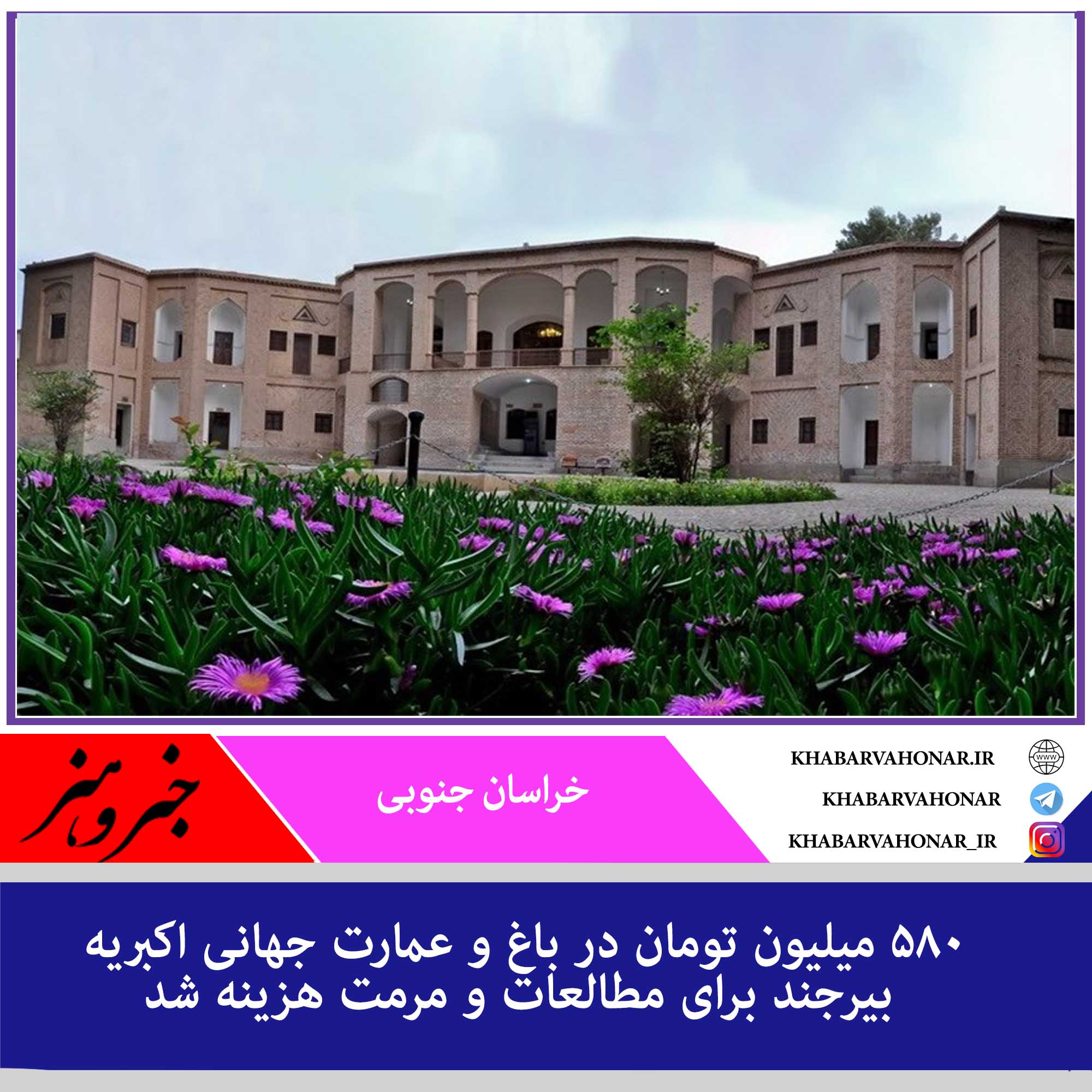 مدیر پایگاه میراث جهانی باغ اکبریه بیرجند گفت: از محل اعتبارات سال ۹۸ تاکنون ۵۸۰ میلیون تومان برای باغ و عمارت جهانی اکبریه تخصیص یافته که ۲۶۰ میلیون تومان صرف مرمت میراث جهانی اکبریه و ۳۲۰ میلیون تومان برای مطالعات و مرمت موزه آن هزینه شده است.