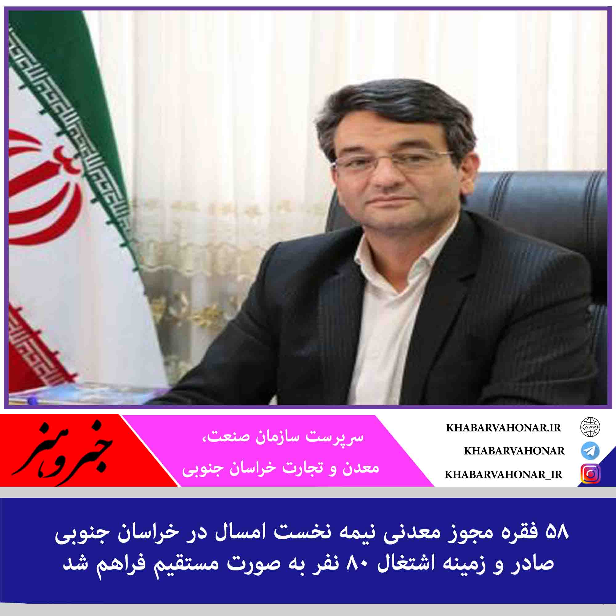 سرپرست سازمان صنعت، معدن و تجارت خراسان جنوبی گفت: ۵۸ فقره مجوز معدنی نیمه نخست امسال در خراسان جنوبی صادر و زمینه اشتغال ۸۰ نفر به صورت مستقیم فراهم شد.