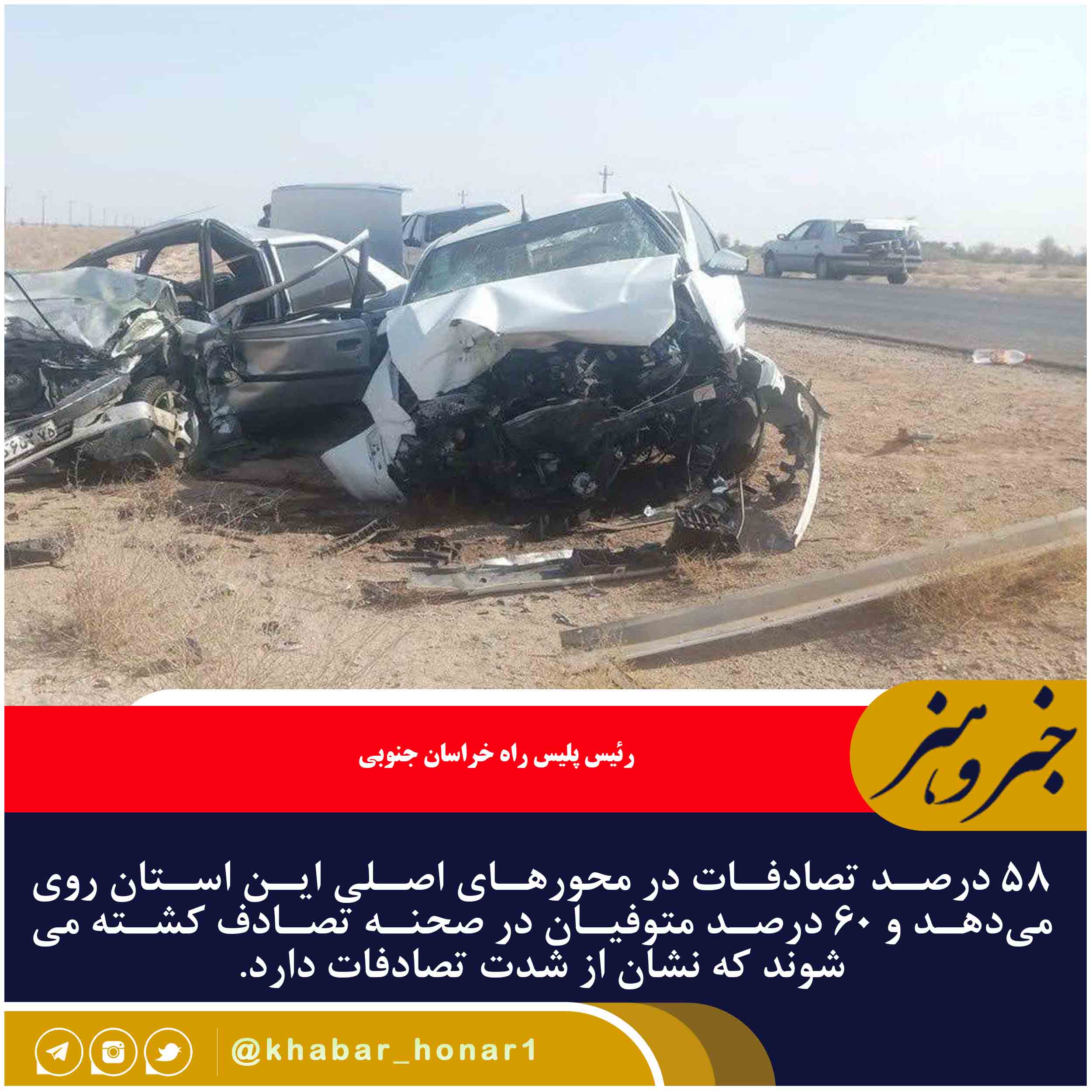 رئیس پلیس راه خراسان جنوبی اعلام کرد: ۵۸ درصد تصادفات در محورهای اصلی این استان روی میدهد و ۶۰ درصد متوفیان در صحنه تصادف کشته میشوند که نشان از شدت تصادفات دارد.