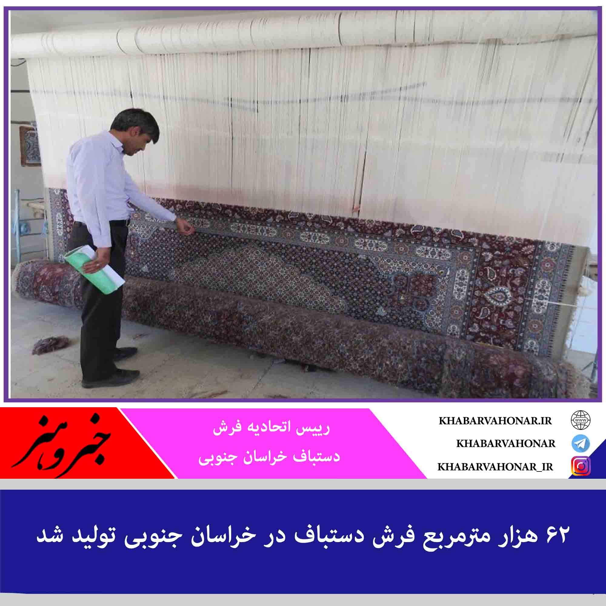 رییس اتحادیه فرش دستباف خراسان جنوبی گفت: در سه ماه نخست سال جاری ۶۲ هزار مترمربع فرش دستباف به ارزش ۹۰ میلیارد تومان در استان تولید شد.