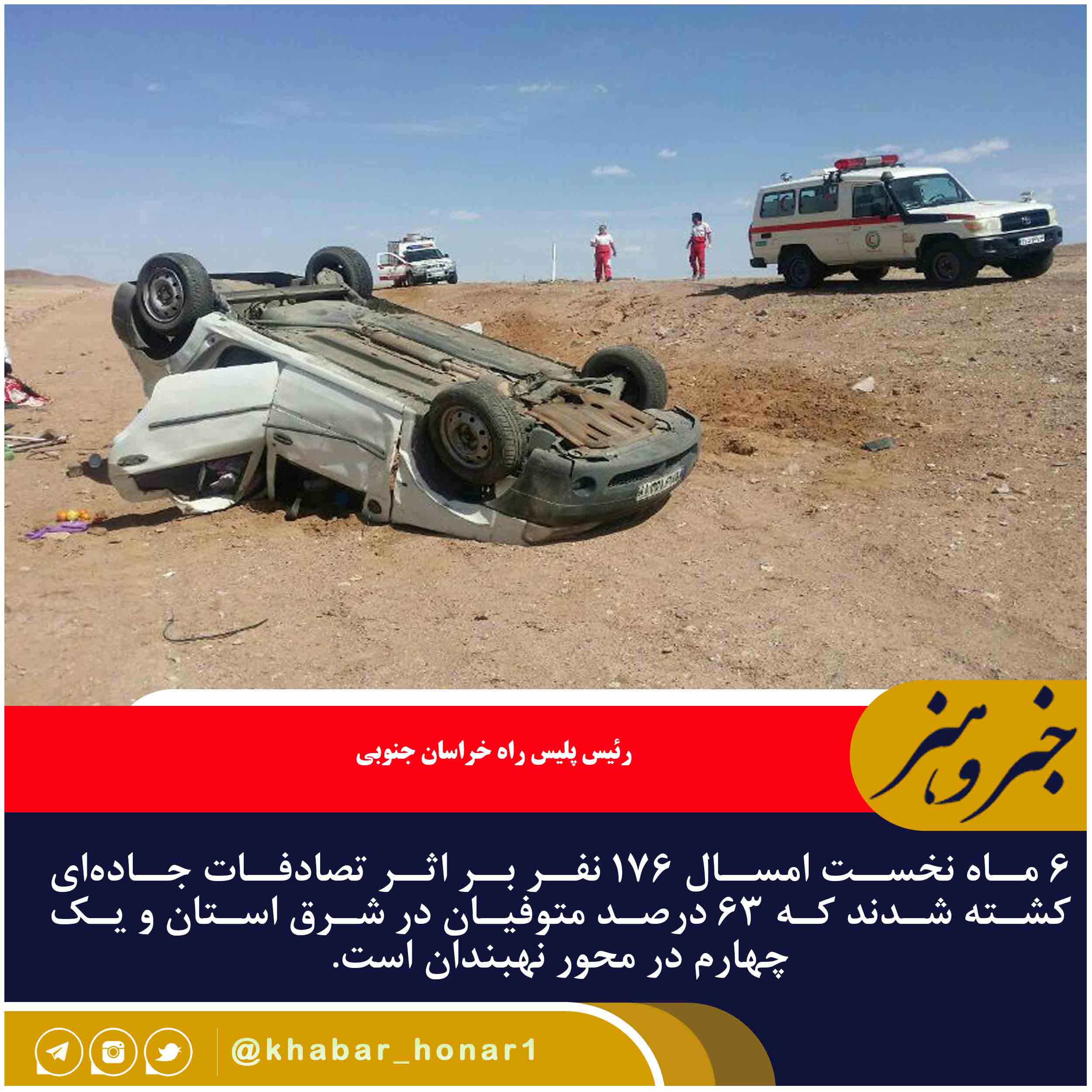 رئیس پلیس راه خراسان جنوبی گفت: ۶ ماه نخست امسال ۱۷۶ نفر بر اثر تصادفات جادهای کشته شدند که ۶۳ درصد متوفیان در شرق استان و یک چهارم در محور نهبندان است.