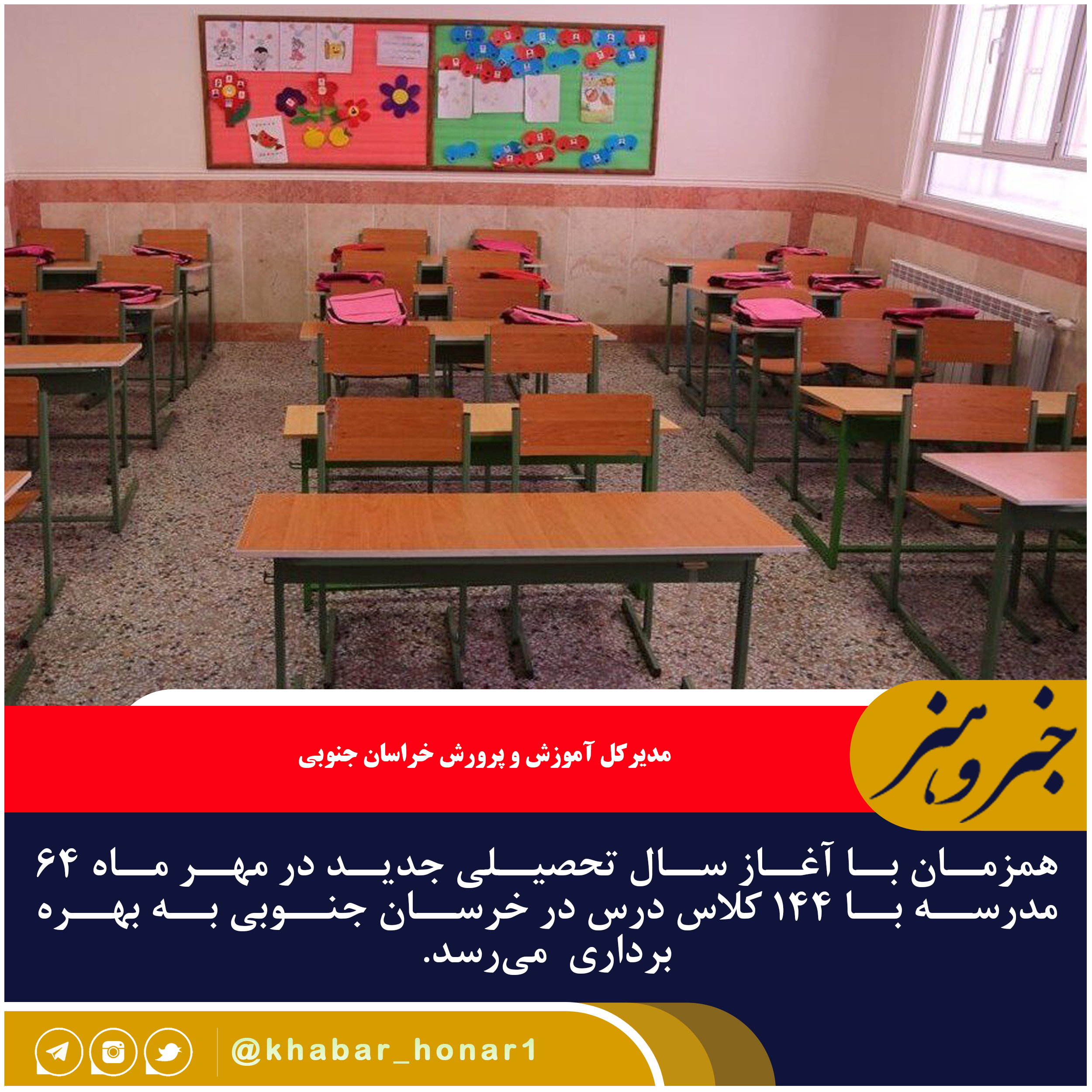 مدیرکل آموزش و پرورش خراسان جنوبی گفت: همزمان با آغاز سال تحصیلی جدید در مهر ماه ۶۴ مدرسه با ۱۴۴ کلاس درس در خرسان جنوبی به بهرهبرداری میرسد.