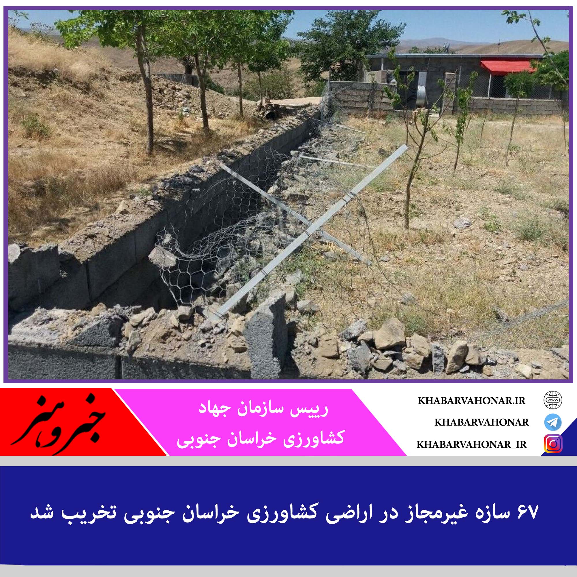 رییس سازمان جهاد کشاورزی خراسان جنوبی گفت: از ابتدای امسال تاکنون ۶۷ مورد ساخت و ساز غیرمجاز در اراضی کشاورزی استان تخریب و ۳۴ مورد تغییر کاربری غیرمجاز نیز شناسایی شد.
