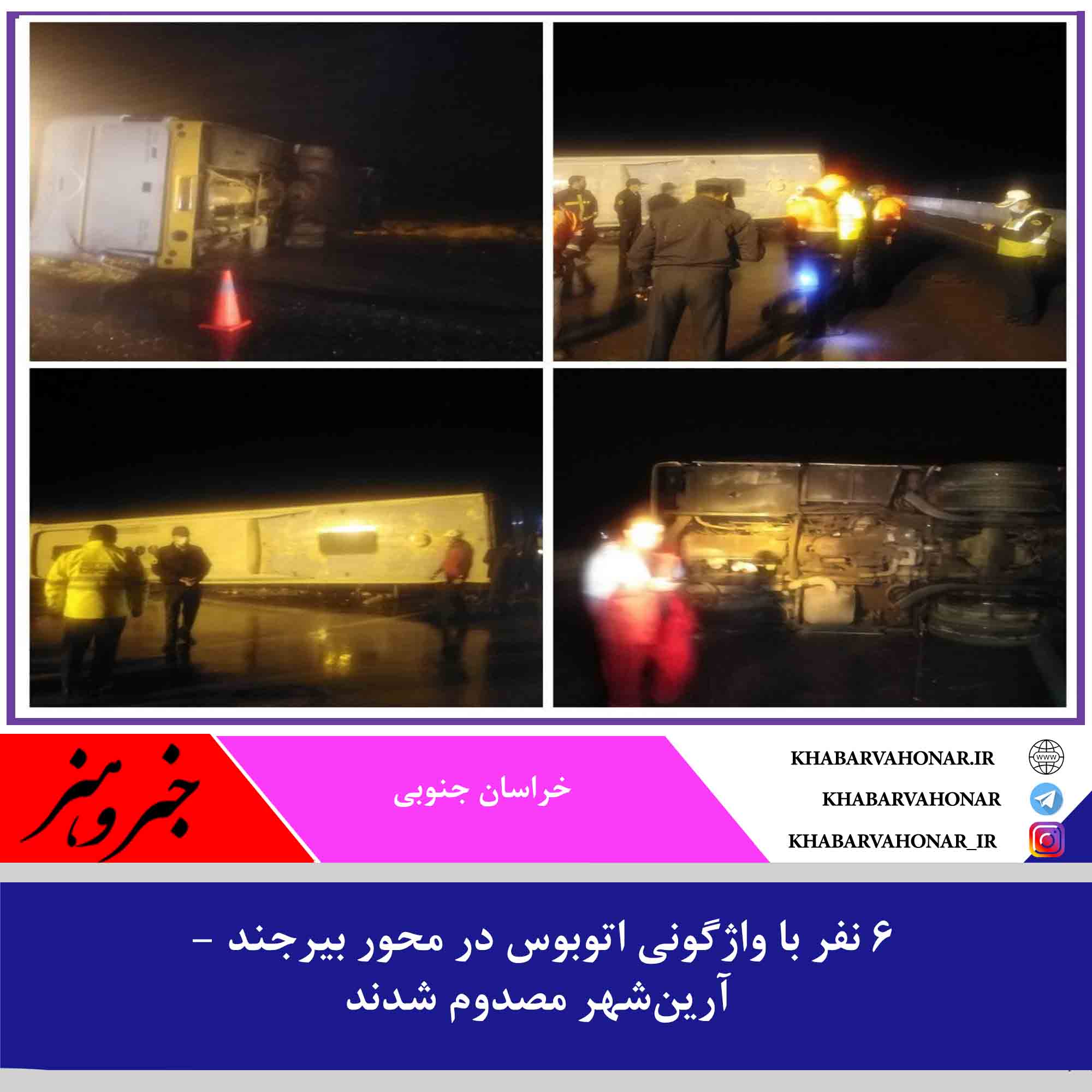 رییس پلیس راه خراسان جنوبی گفت: براثر واژگونی یک دستگاه اتوبوس در محور بیرجند – آرینشهر ۶ نفر مصدوم شدند و با تلاش چند ساعته امدادگران و پلیس این محور بازگشایی شد.