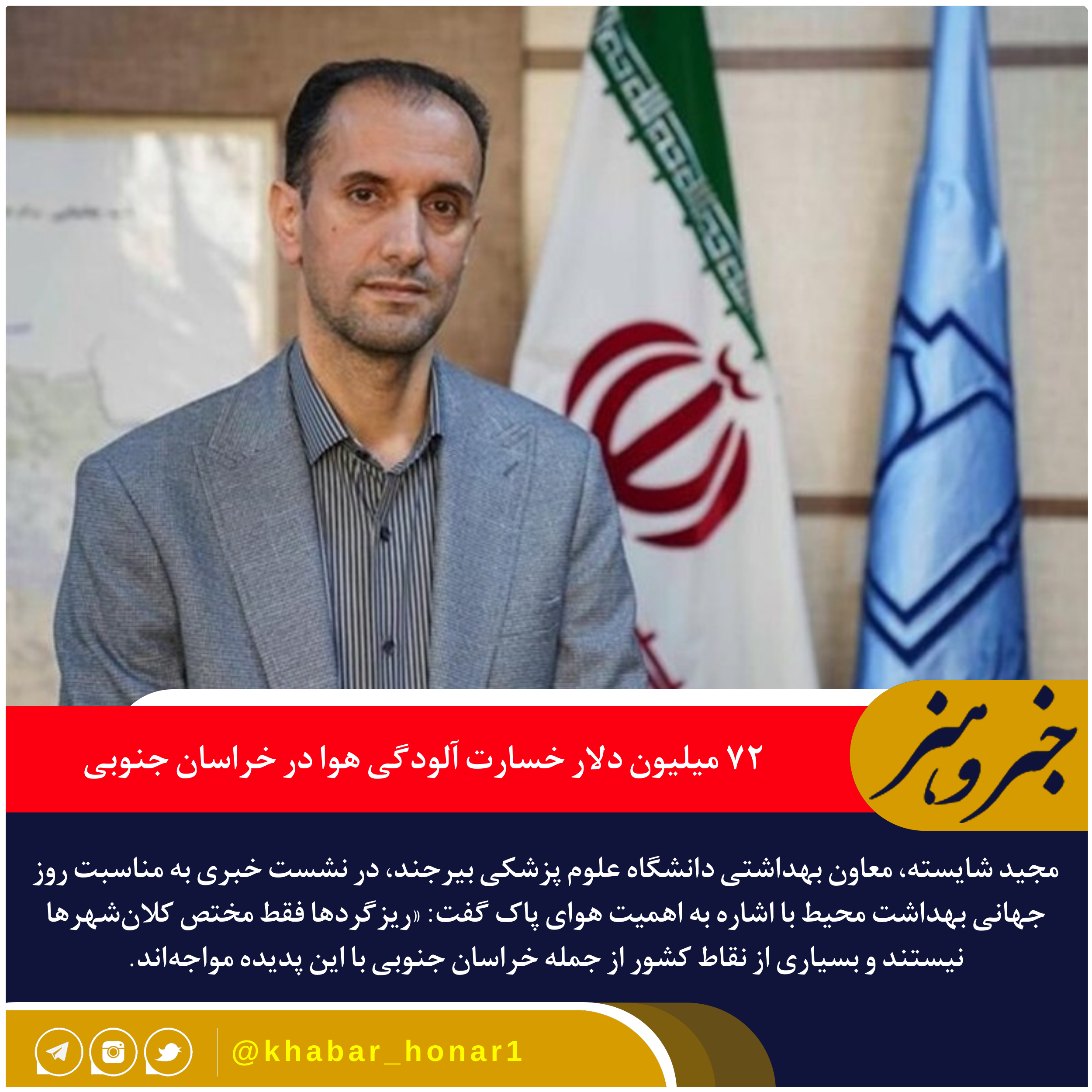 به گزارش خبر و هنر، مجید شایسته، معاون بهداشتی دانشگاه علوم پزشکی بیرجند، در نشست خبری به مناسبت روز جهانی بهداشت محیط با اشاره به اهمیت هوای پاک گفت: «ریزگردها فقط مختص کلانشهرها نیستند و بسیاری از نقاط کشور از جمله خراسان جنوبی با این پدیده مواجهاند. کاهش ریزگردها دشوار است اما کاهش مواجهه مردم با آن تأثیر قابل توجهی بر سلامت عمومی دارد.»
