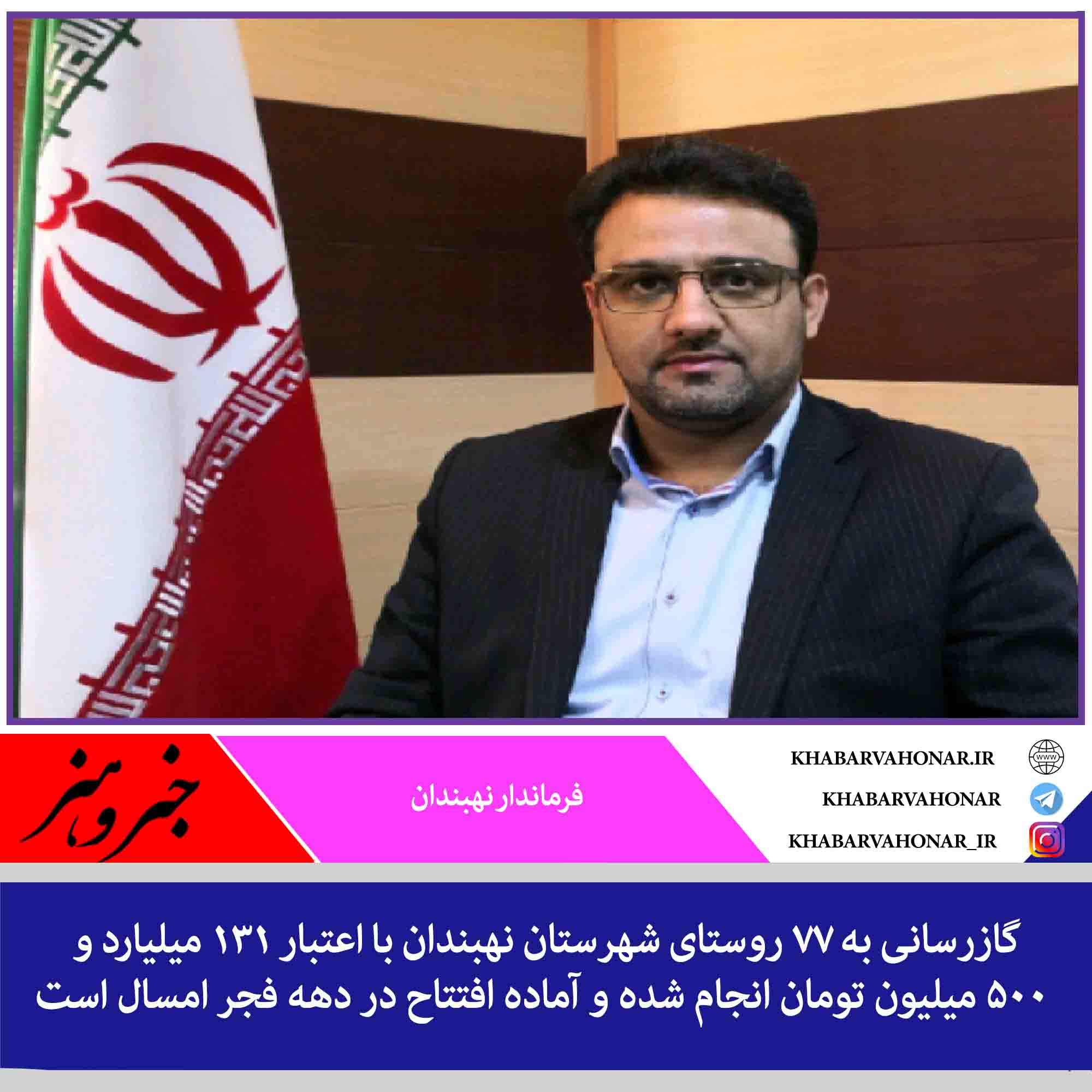 فرماندار نهبندان گفت: گازرسانی به ۷۷ روستای این شهرستان با اعتبار ۱۳۱ میلیارد و ۵۰۰ میلیون تومان انجام شده و آماده افتتاح در دهه فجر امسال است.