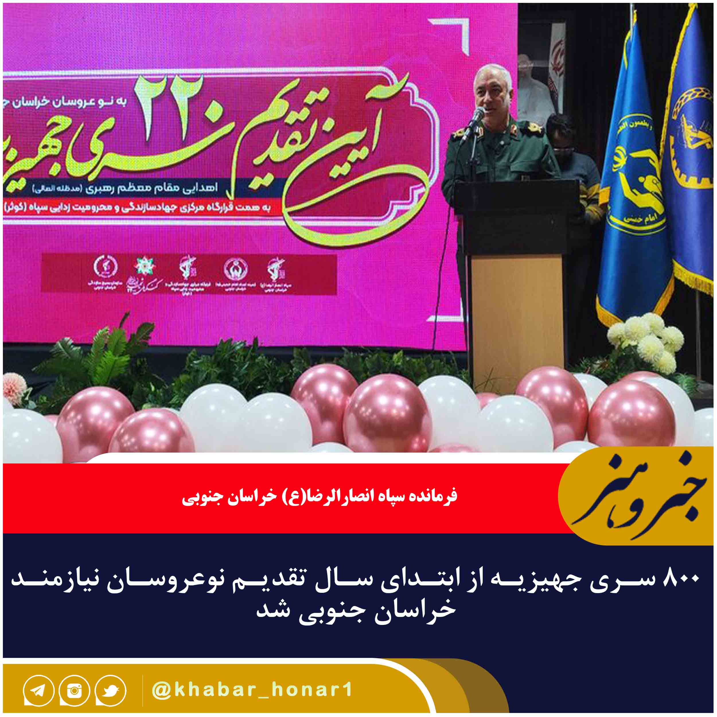 فرمانده سپاه انصارالرضا(ع) خراسان جنوبی گفت: ۸۰۰ سری جهیزیه از ابتدای سال تقدیم نوعروسان نیازمند خراسان جنوبی شد.