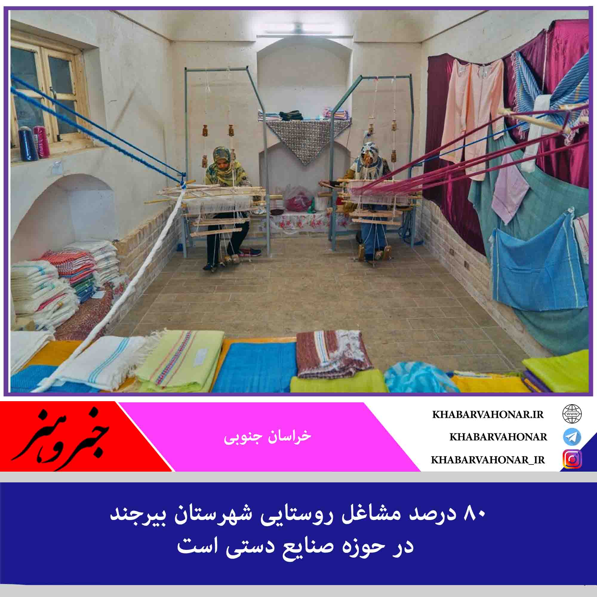 رییس اداره میراث فرهنگی، گردشگری و صنایع دستی شهرستان بیرجند گفت: ۸۰ درصد مشاغل ایجاد شده روستایی این شهرستان در حوزه صنایع دستی است که با ایجاد تعداد زیادی شغل به اقتصاد روستا کمک کرده است.