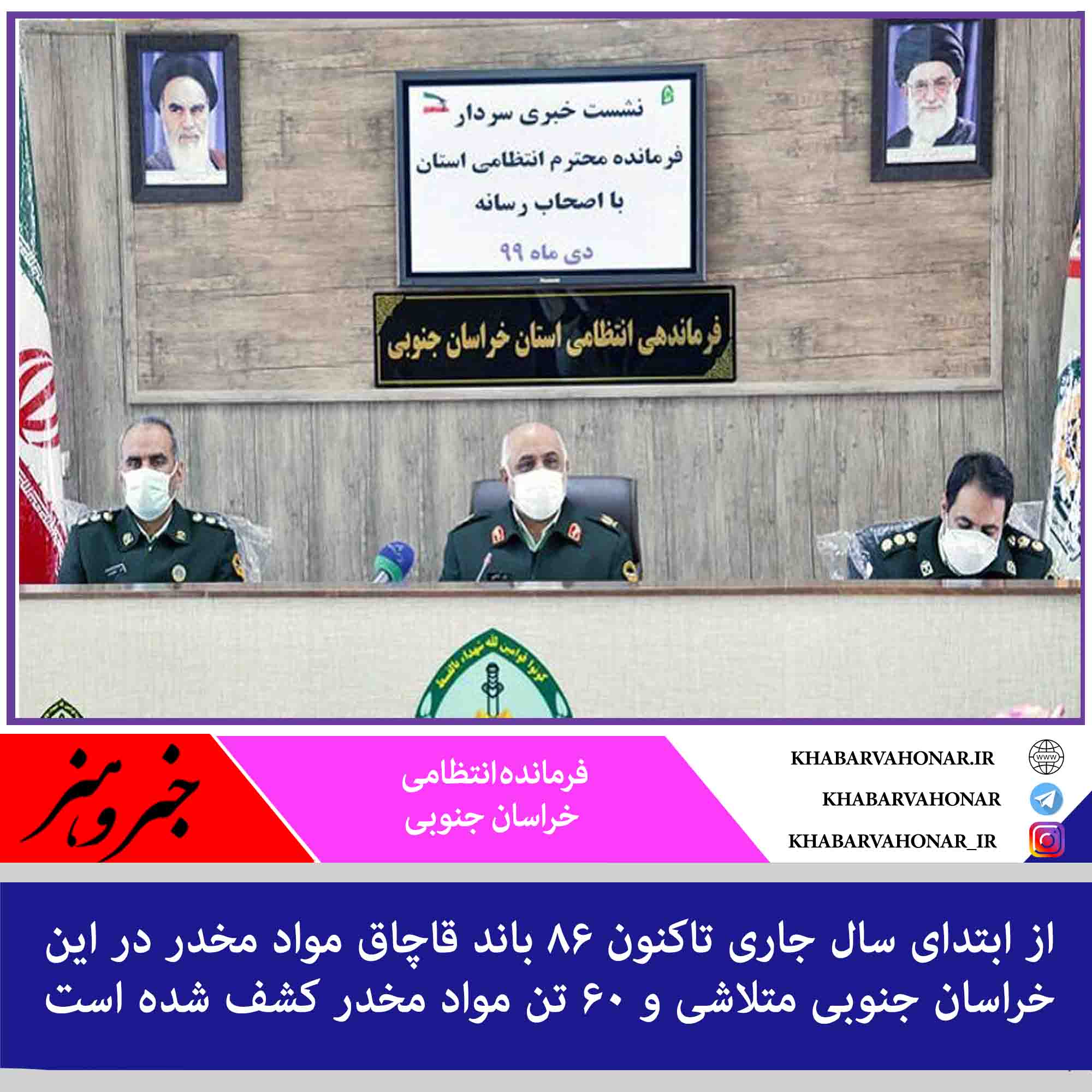 فرمانده انتظامی خراسان جنوبی گفت: از ابتدای سال جاری تاکنون ۸۶ باند قاچاق مواد مخدر در این استان متلاشی و ۶۰ تن مواد مخدر کشف شده است.