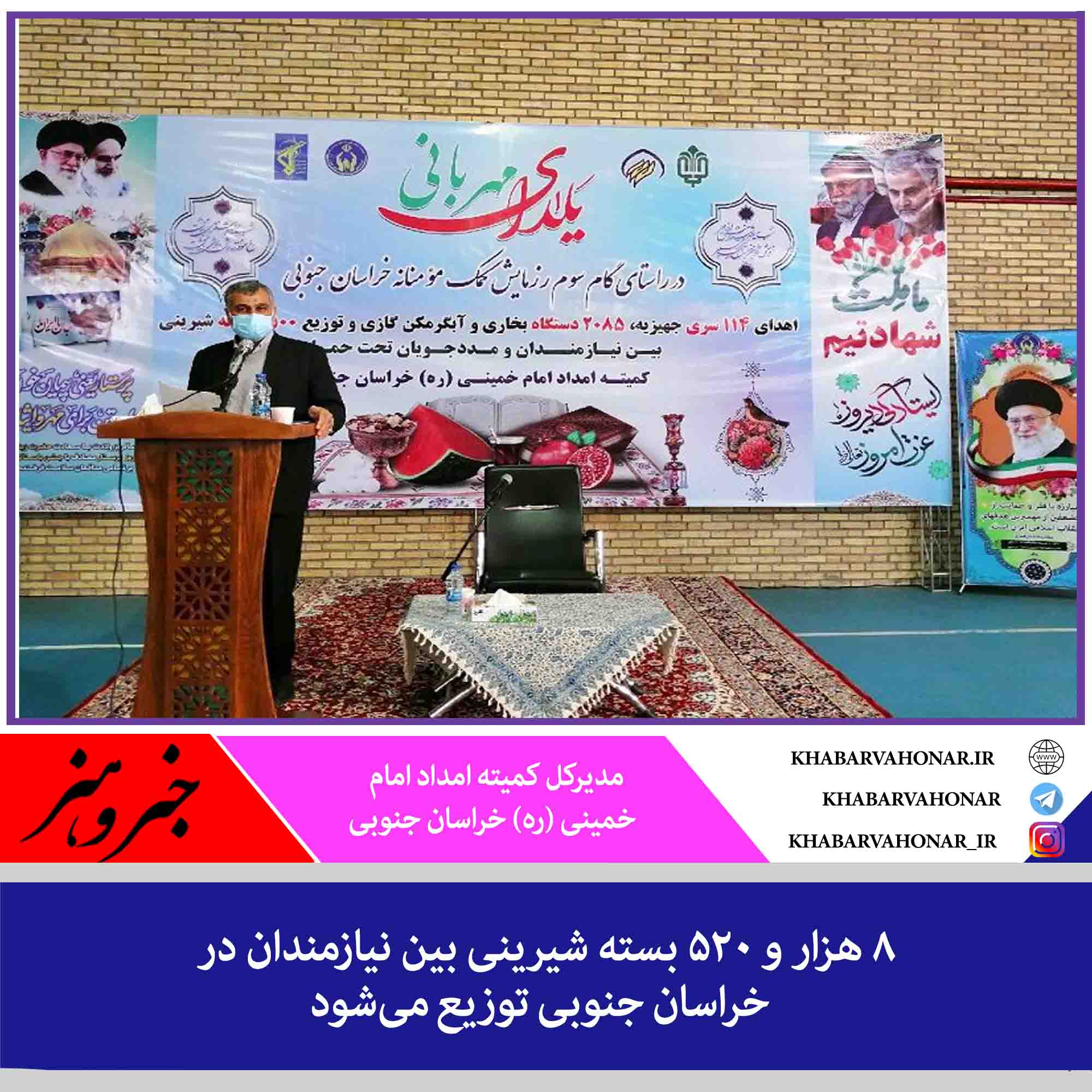 مدیرکل کمیته امداد امام خمینی (ره) خراسان جنوبی گفت: هشت هزار و ۵۲۰ بسته شیرینی به ارزش ۴۰۰ میلیون تومان با همراهی یک خیر به مناسبت شب یلدا بین نیازمندان زیر پوشش این نهاد توزیع میشود.