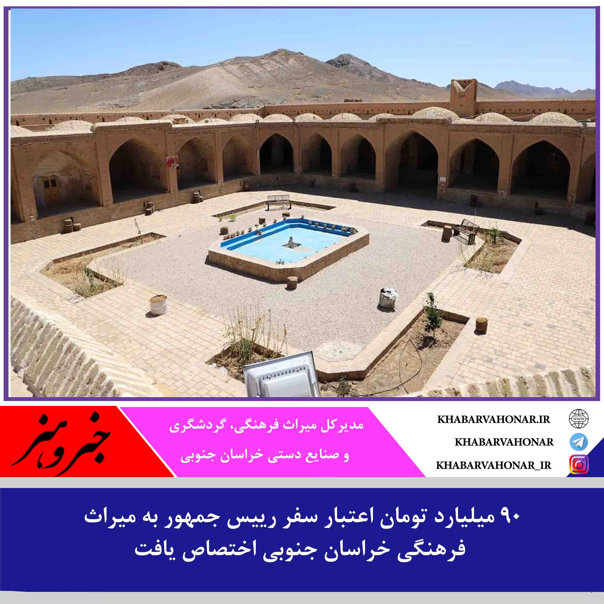 مدیرکل میراث فرهنگی، گردشگری و صنایع دستی خراسان جنوبی گفت: ۹۰ میلیارد تومان اعتبار سفر استانی رییس جمهور به حوزه میراث فرهنگی، صنایع دستی و گردشگری استان اختصاص یافت که طی ۲ سال آینده هزینه میشود.