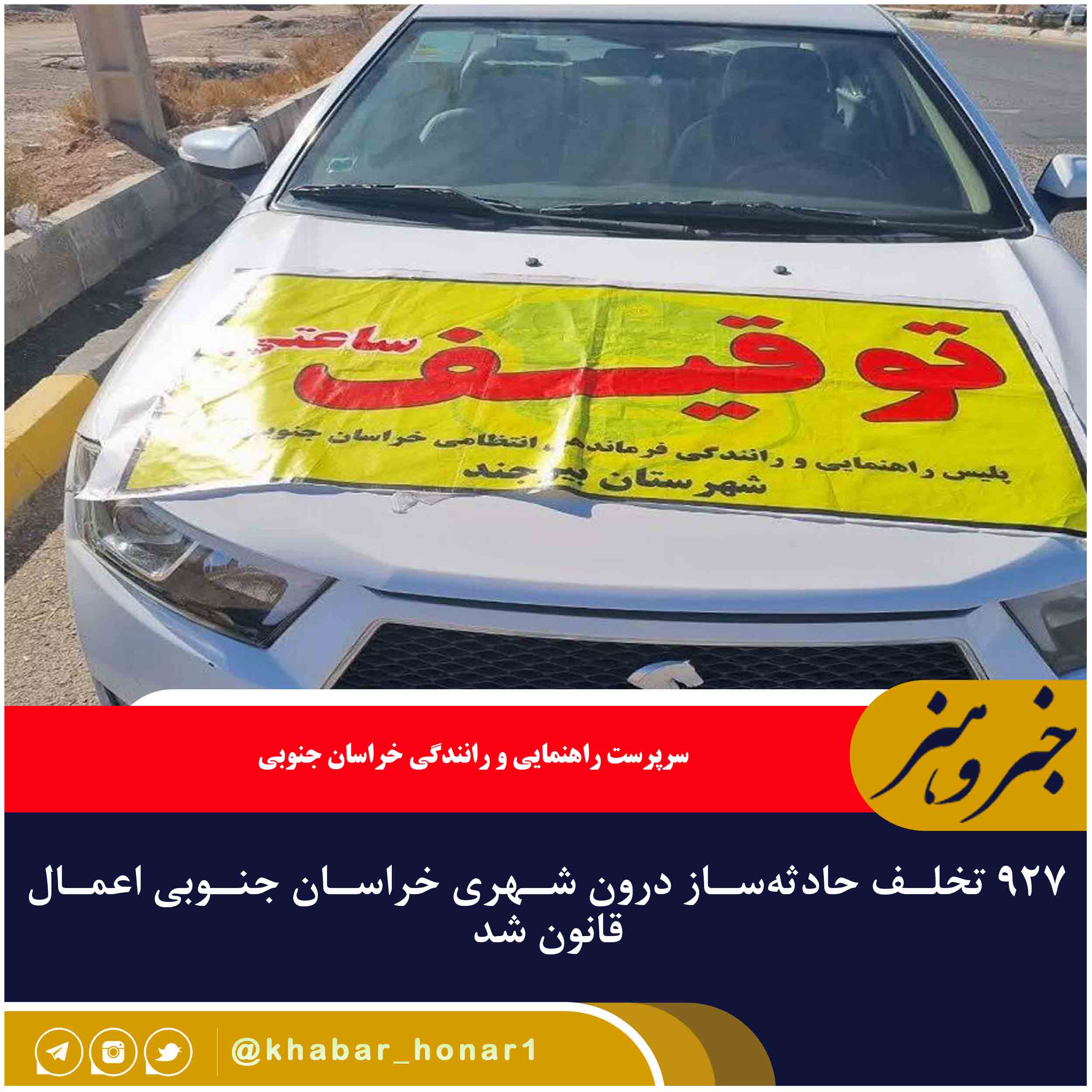 سرپرست راهنمایی و رانندگی خراسان جنوبی گفت: ۹۲۷ تخلف حادثه ساز رانندگان درون شهری استان در هفته گذشته اعمال قانون شد که نسبت به آمار ۷۰۲ مورد هفته قبلتر حدود ۳۲ درصد افزایش داشته است.