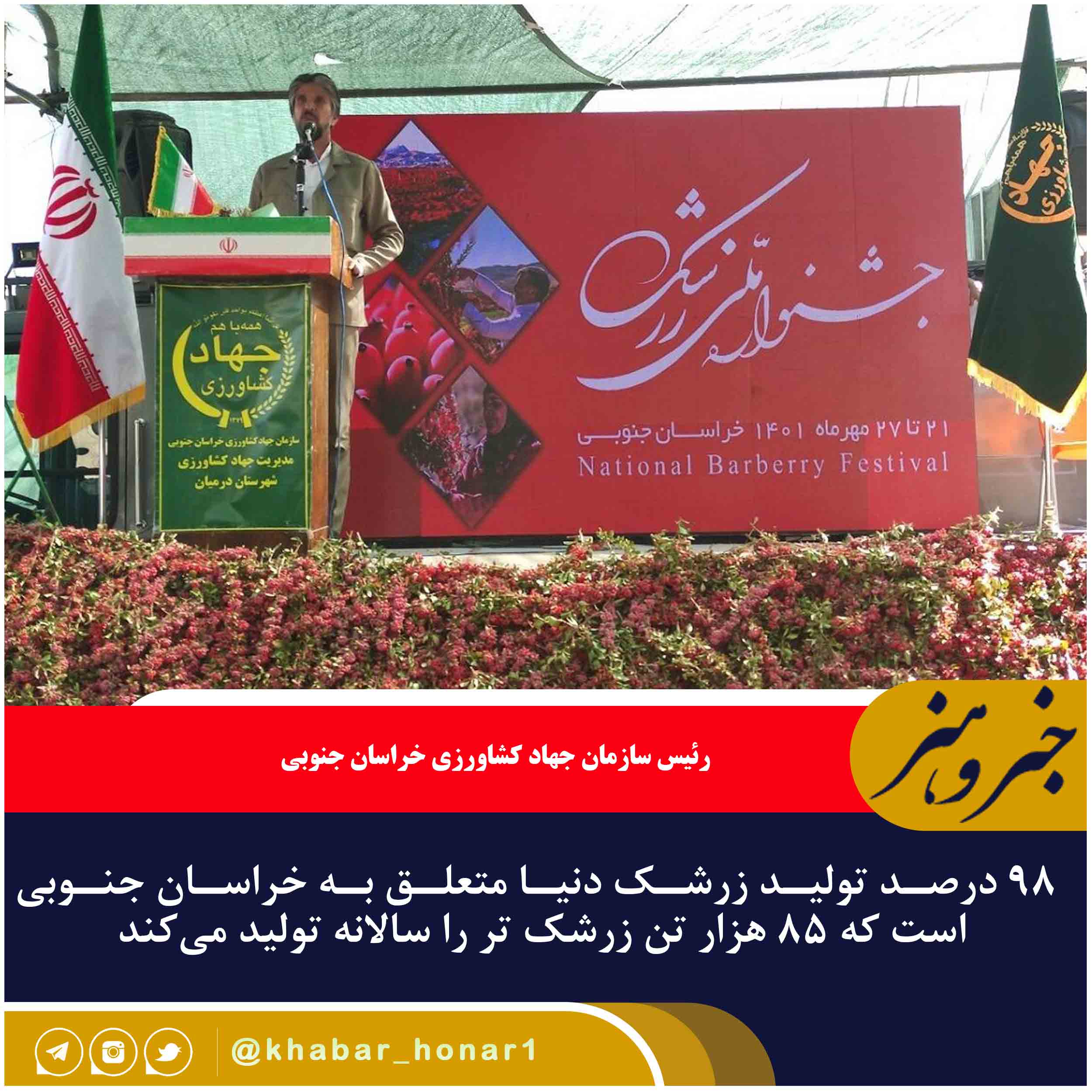 وی گفت: ۹۸ درصد تولید زرشک دنیا متعلق به خراسان جنوبی است که ۸۵ هزار تن زرشک تر را سالانه تولید میکند.
