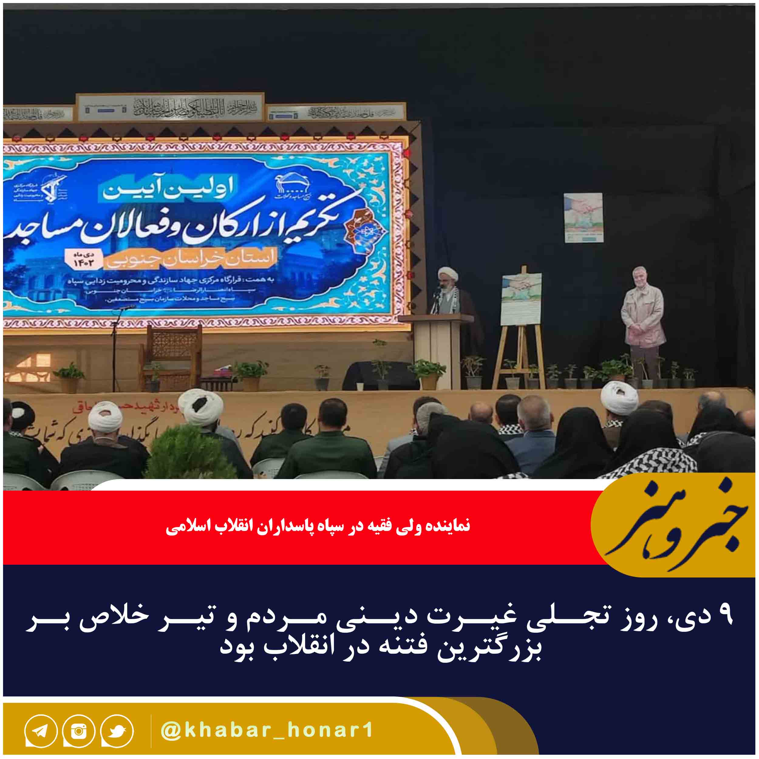?نماینده ولی فقیه در سپاه پاسداران انقلاب اسلامی گفت: ۹ دی، روز تجلی غیرت دینی مردم و تیر خلاص بر بزرگترین فتنه در انقلاب بود.