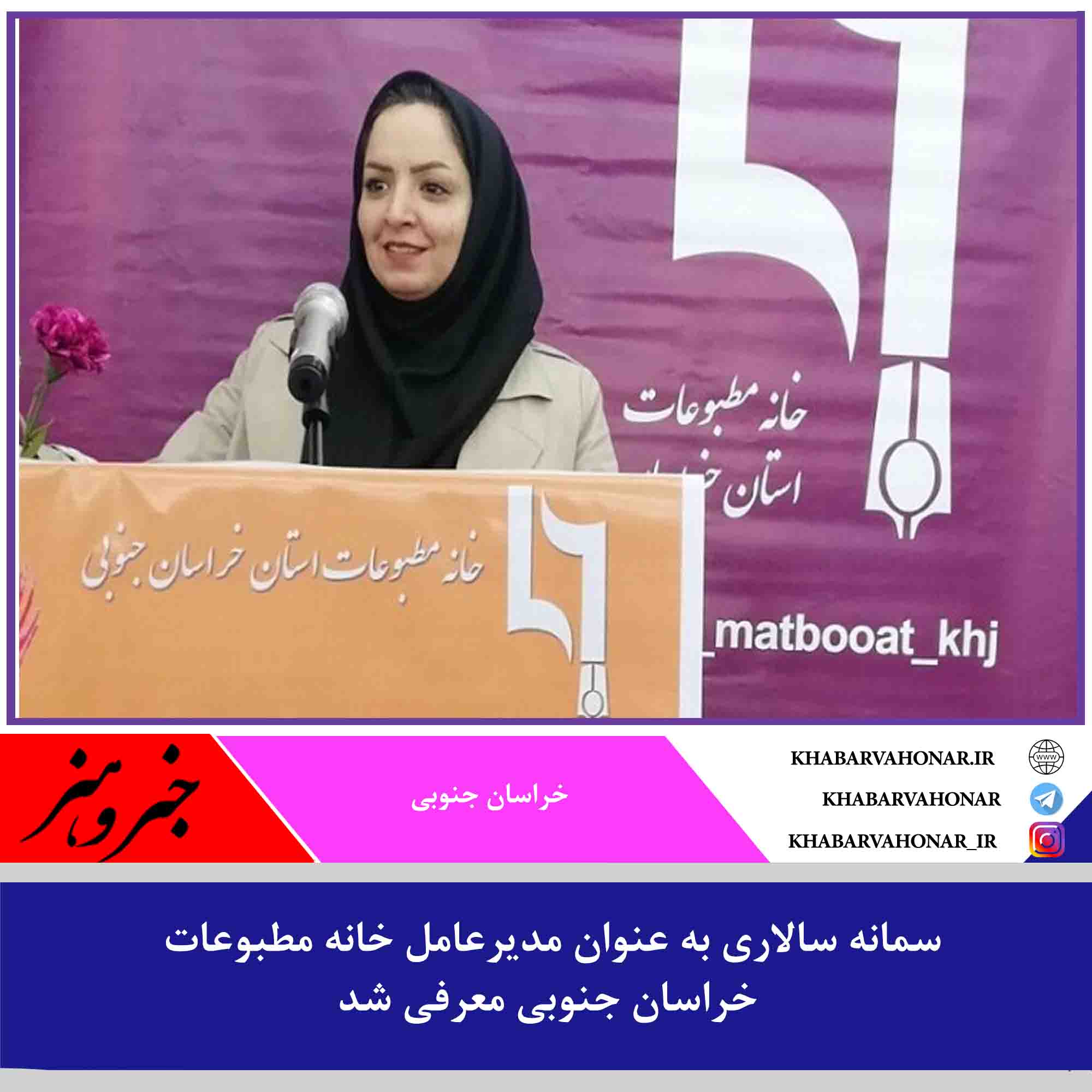?️با رای اعضای هیئت مدیره خانه مطبوعات خراسان جنوبی سمانه سالاری برای یک دوره دیگر به عنوان مدیرعامل این تشکل صنفی رسانهای استان انتخاب شد. سالاری ، دکترای مدیریت و به مدت ۴ سال مسوولیت اجرایی خانه مطبوعات خراسان جنوبی را بر عهده داشته است . پیش از این با انتخاب اعضای هیات مدیره خانه مطبوعات استان ، محمود حیدری ، مدیر مسوول روزنامه امروز خراسان جنوبی نیز به عنوان رئیس هیات مدیره ، زینب رمضانی ، مدیر خبرگزاری شبستان به عنوان نائب رئیس و فاطمه زهرا قاسمی ، خبرنگار روزنامه زعفران به عنوان خزانه دار خانه