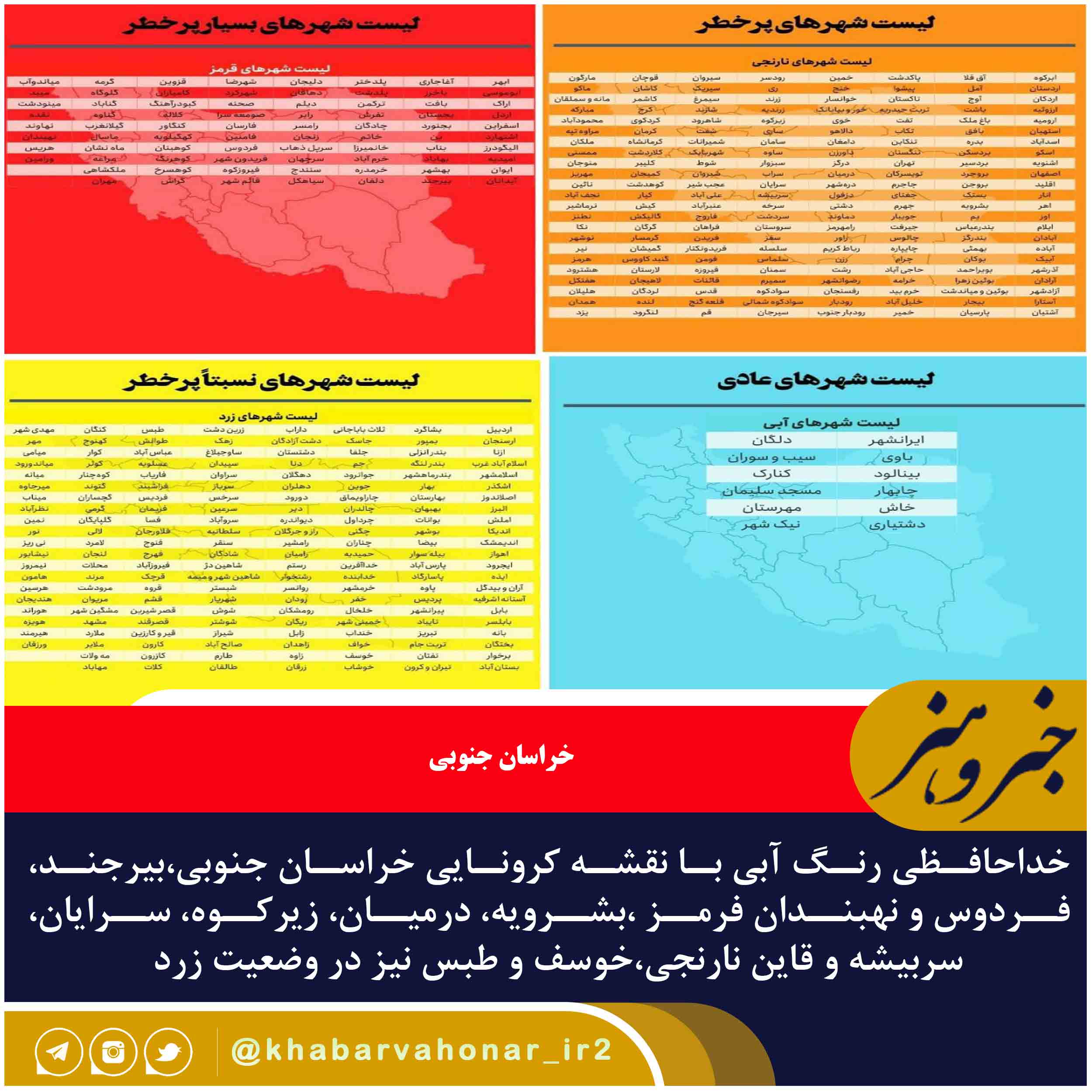?همچنین شهرستانهای بشرویه، درمیان، زیرکوه، سرایان، سربیشه و قاین در وضعیت نارنجی یا پرخطر قرار گرفتند.
