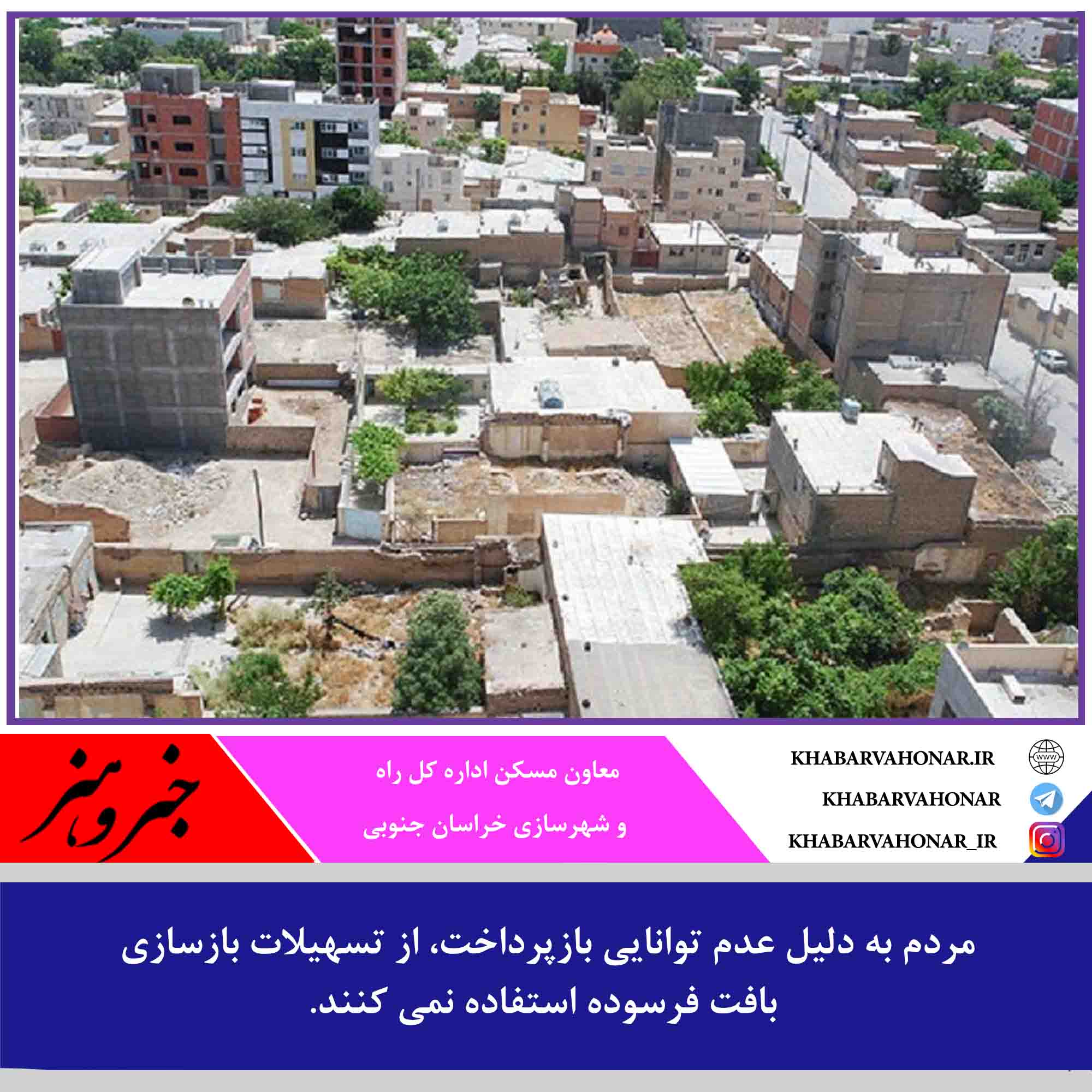 ?معاون مسکن اداره کل راه و شهرسازی خراسان جنوبی گفت: مردم به دلیل عدم توانایی بازپرداخت، از تسهیلات بازسازی بافت فرسوده استفاده نمی کنند.