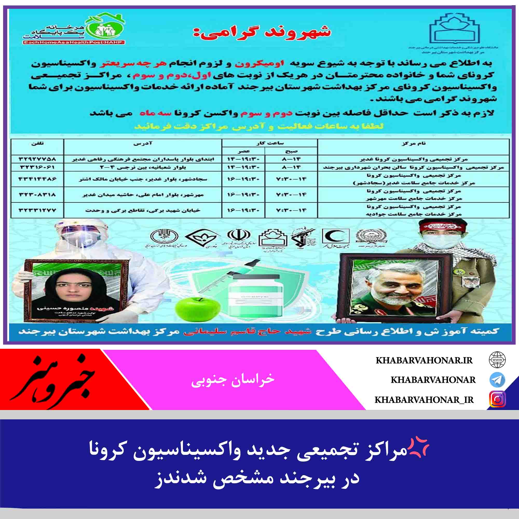 ?با توجه به شیوع سویه اومیکرون و لزوم انجام هرچه سریعتر واکسیناسیون همگانی در هریک از نوبت های اول،دوم و سوم ، مراکـز تجمیـعی واکسیناسیون کرونای مرکز بهداشت شهرستان بیرجند، آماده ارائه خدمات واکسیناسیون به شهروندان گرامی طبق برنامه زمانبندی جدول مندرج در تصویر می باشند