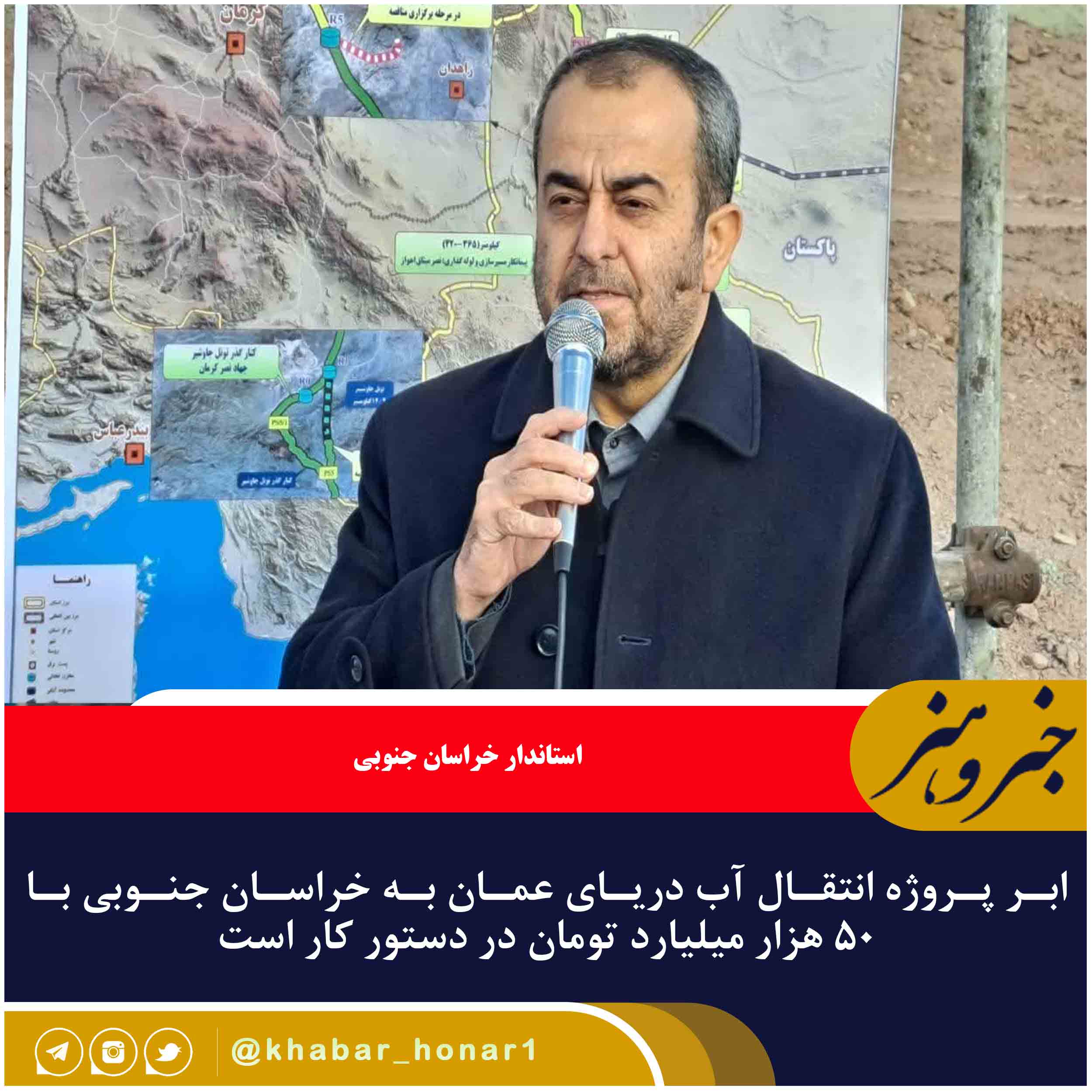 ?استاندار خراسان جنوبی گفت: ابر پروژه انتقال آب دریای عمان به استان خراسان جنوبی با ۵۰ هزار میلیارد تومان اعتبار در دستور کار است.