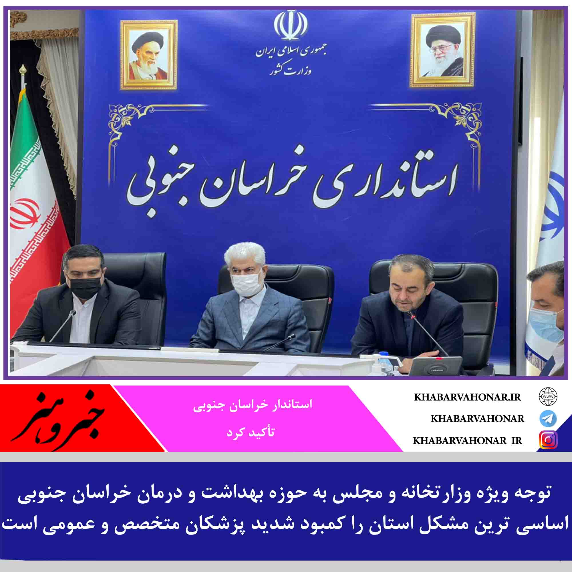 ?استاندار خراسان جنوبی بر توجه ویژه وزارت بهداشت، درمان و آموزش پزشکی و مجلس شورای اسلامی به حوزه بهداشت و درمان استان تأکید کرد.
