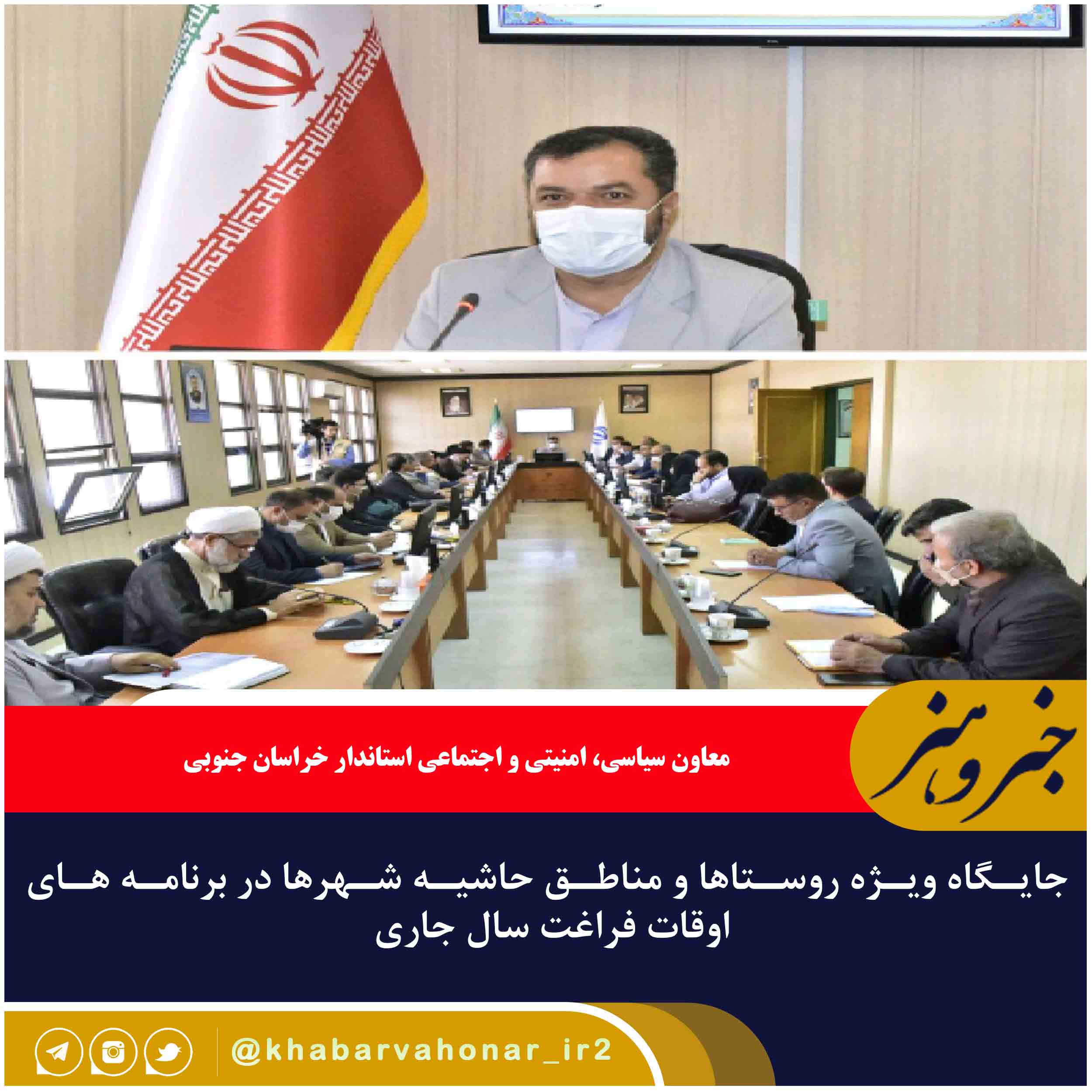 ?معاون سیاسی، امنیتی و اجتماعی استاندار خراسان جنوبی با بیان اینکه نباید برنامه های اوقات فراغت امسال تنها معطوف به شهرها باشد، تأکید کرد: امسال باید در برنامه های اوقات فراغت، به مناطق کم برخوردار حاشیه شهر که در معرض آسیب قرار دارند و نقاط روستایی، توجه ویژه و جدی صورت گیرد.