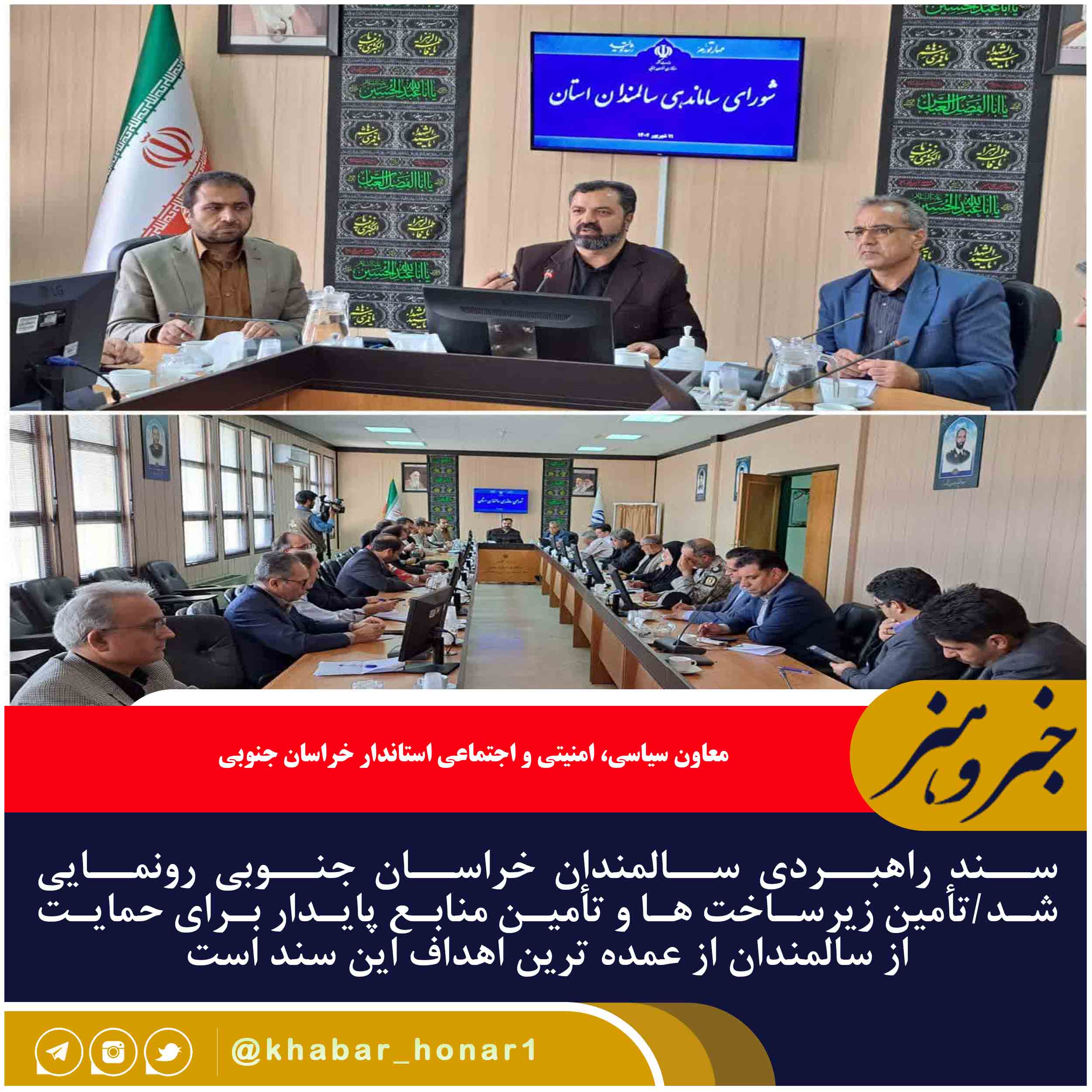 ?معاون استاندار با اشاره به اقدامات انجام شده با محوریت بهزیستی خراسان جنوبی برای تدوین سند سالمندی استان گفت: این سند دارای شش هدف، ۱۳ راهبرد و ۱۴۶ برنامه استانی است که توسط دستگاه های اصلی و همکار اجرایی خواهد شد.