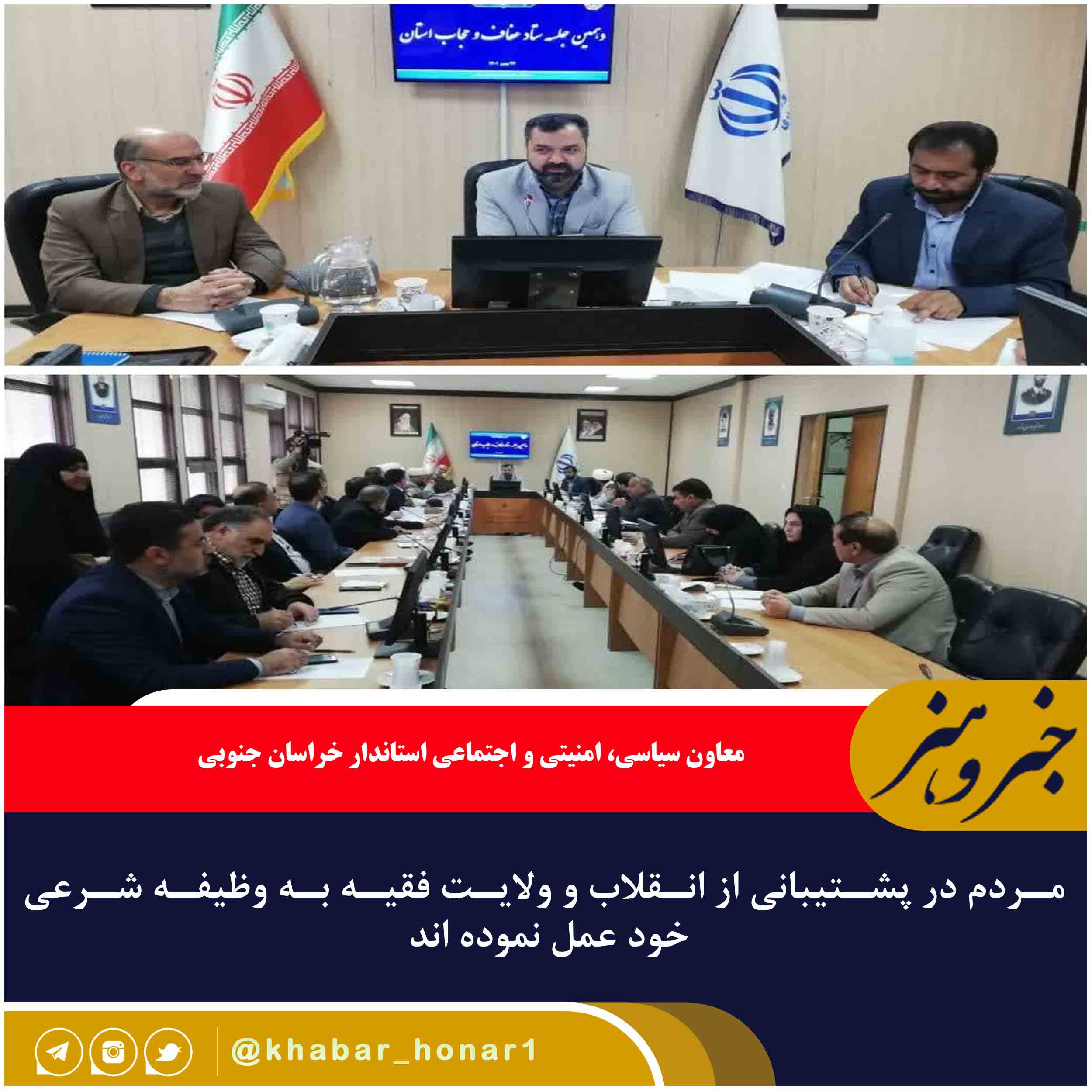 ?معاون سیاسی، امنیتی و اجتماعی استاندار خراسان جنوبی گفت: مردم در پشتیبانی از انقلاب و ولایت فقیه به وظیفه شرعی خود عمل نموده و همواره در صحنه حاضر می باشند.