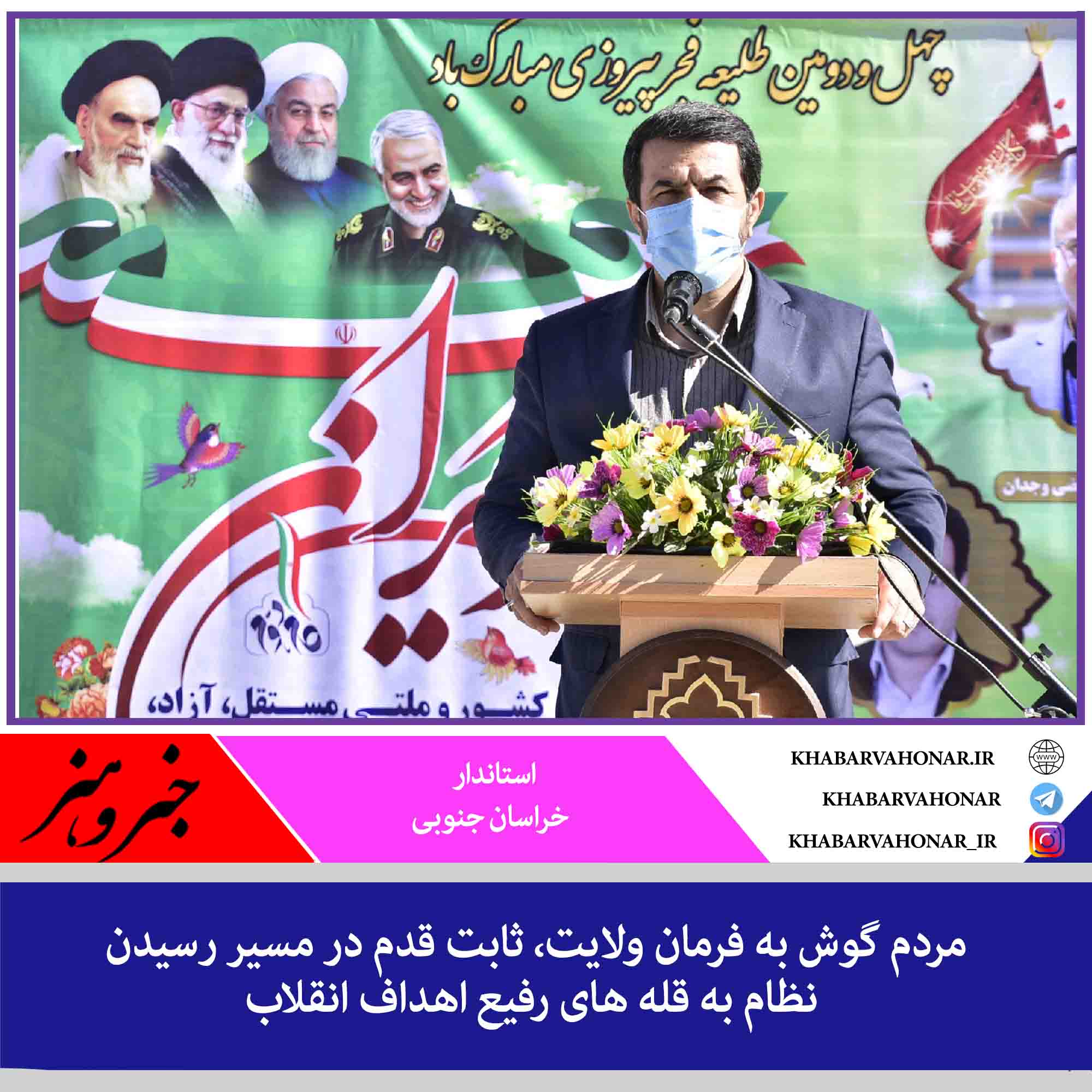 ?استاندار خراسان جنوبی گفت: مردم با هر گرایش سیاسی، گوش به فرمان ولایت و رهبری، ثابت قدم در جهت رسیدن انقلاب اسلامی به قله های رفیع اهداف انقلاب در حرکت هستند.