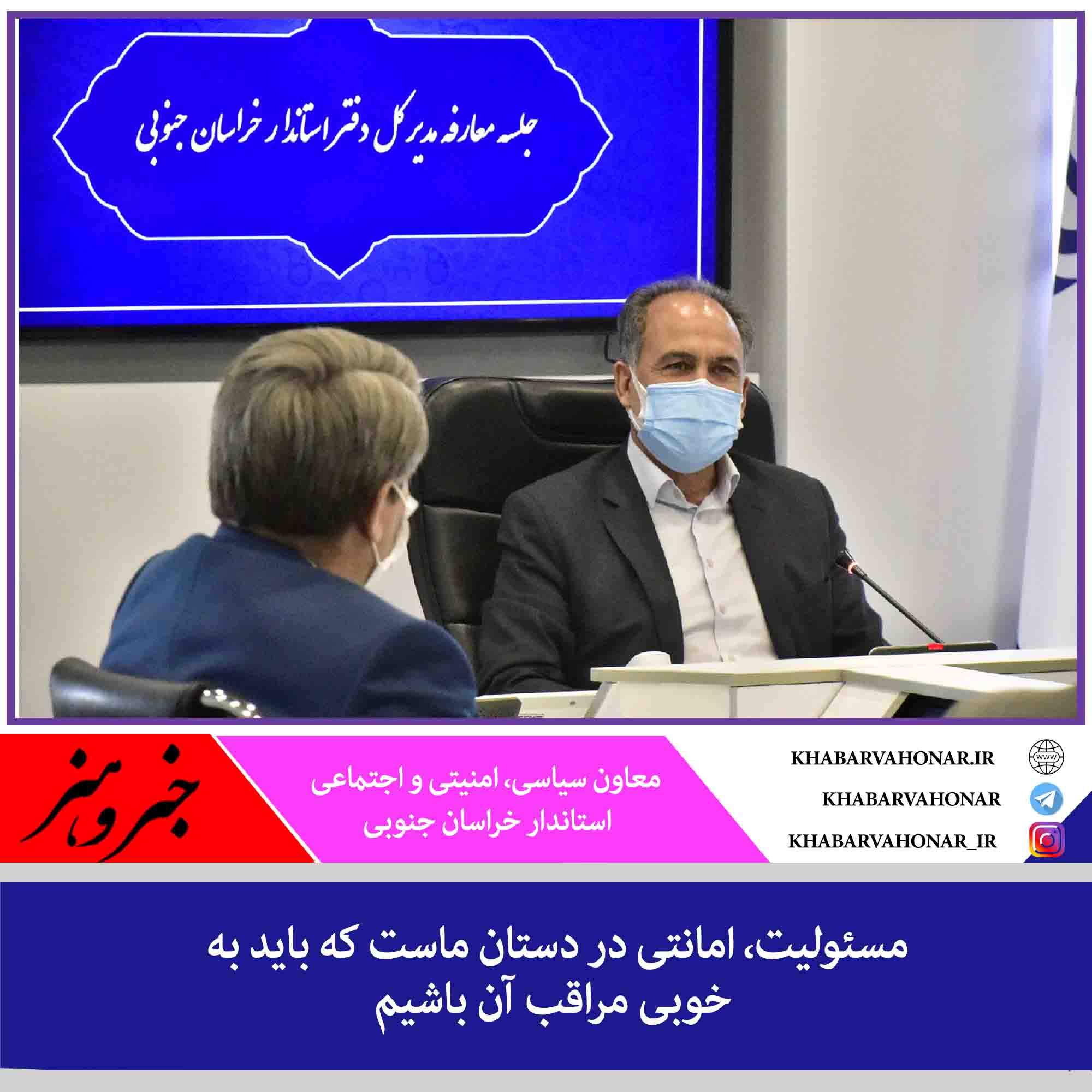 ?معاون سیاسی، امنیتی و اجتماعی استاندار خراسان جنوبی گفت: مسئولیت، امانتی در دستان ماست که باید به خوبی مراقب آن باشیم.